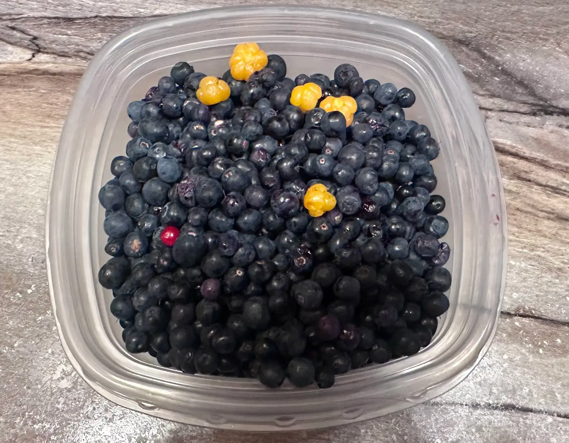There were some lowbush cranberries (also called lingonberries) too, but they weren’t quite ripe yet—still a little firm and extra sour. We left most of those to finish ripening. And then there were crowberries—small, black, and kind of mild on their own, but really good in baked goods or jam.