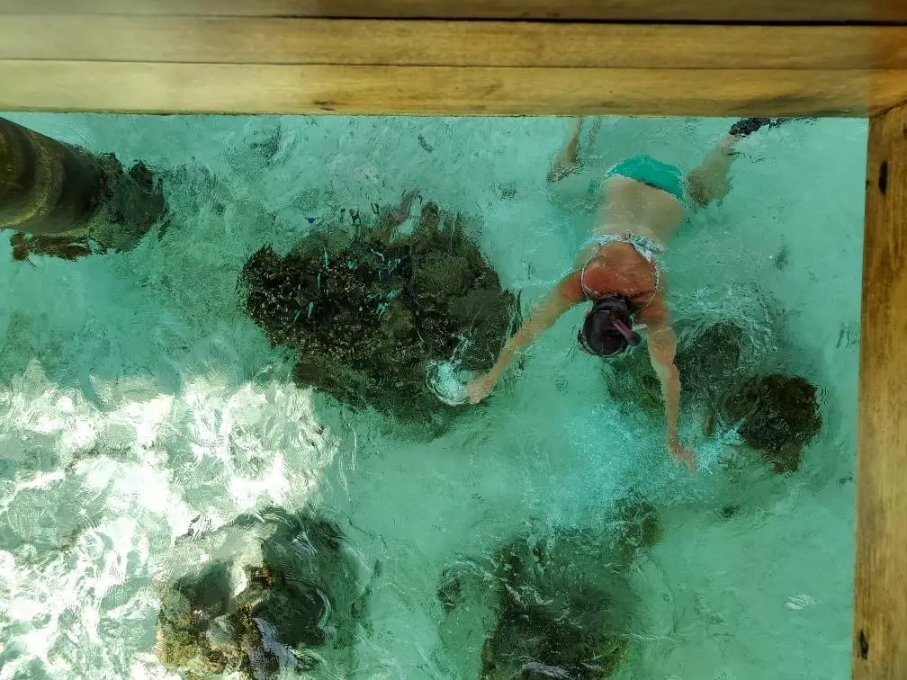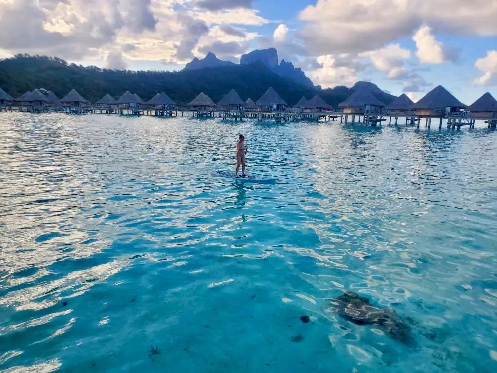 After my thrilling jet ski adventure, Rosie and I made our way to the Continental, our over-water bungalow, which turned out to be an absolutely extraordinary experience. The room featured a captivating glass “coffee table” that allowed us to witness the mesmerizing underwater world right beneath our feet. Adding to the enchantment, the hotel provided fish snacks, and the coffee table conveniently slid open, enabling us to feed the fish directly from our room! Additionally, the hotel offered complimentary use of kayaks, canoes, and SUPs. I had been eager to try stand-up paddleboarding (SUP) for a few years, so I gave it a shot. It took a bit of time to find my balance, but I eventually got the hang of it. I even had the pleasure of taking Rosie along for a ride. As I paddled around the tranquil lagoon, Rosie enjoyed an afternoon of snorkeling in the most beautiful water you can imagine. We swam well into the evening, basking in yet another breathtaking sunset, followed by a star-studded night sky that seemed to stretch on forever.