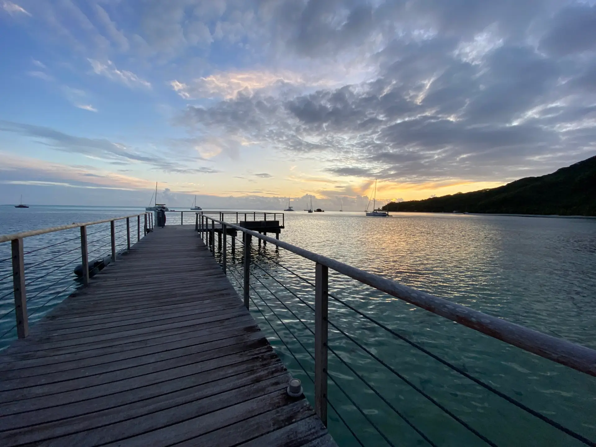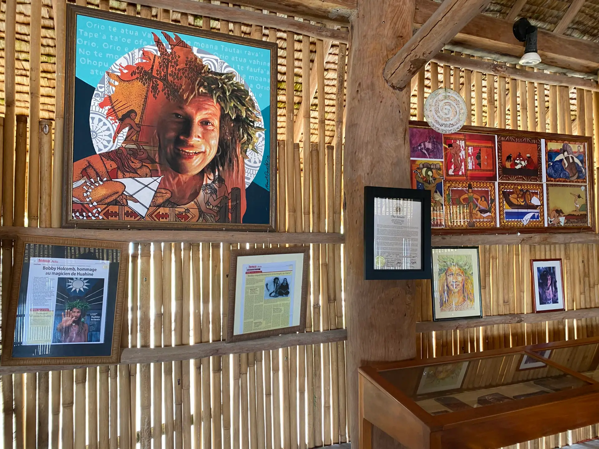 On our last morning there, our Airbnb hosts surprised us with homemade crepes and honey. After a tasty breakfast, we set out to finish our exploration of this beautiful island, visiting Marae Manunu Beach, Fare Potee Maeva, and a fishpond, along with a few other places that showcased Huahine’s rich culture and history. Fare Potee Maeva, a traditional meeting house, was particularly interesting with its intricate carvings and cultural significance. It’s a place where stories are passed down through generations, and where traditional dances and songs are practiced and performed. Here we learned of the legacy of Bobby Holcomb, Jr., a world renowned musician and artist who had left Honolulu and made Tahiti his home. Bobby passed away at a young age, but was an cultural icon of Tahiti, and his memory lives on in Fare Potee Maeva. After our final island tour, we headed back to the airport, excited for our final stop of this vacation: Bora Bora.