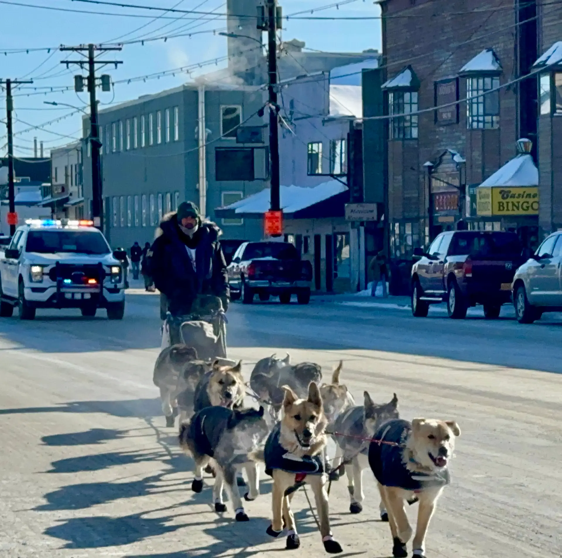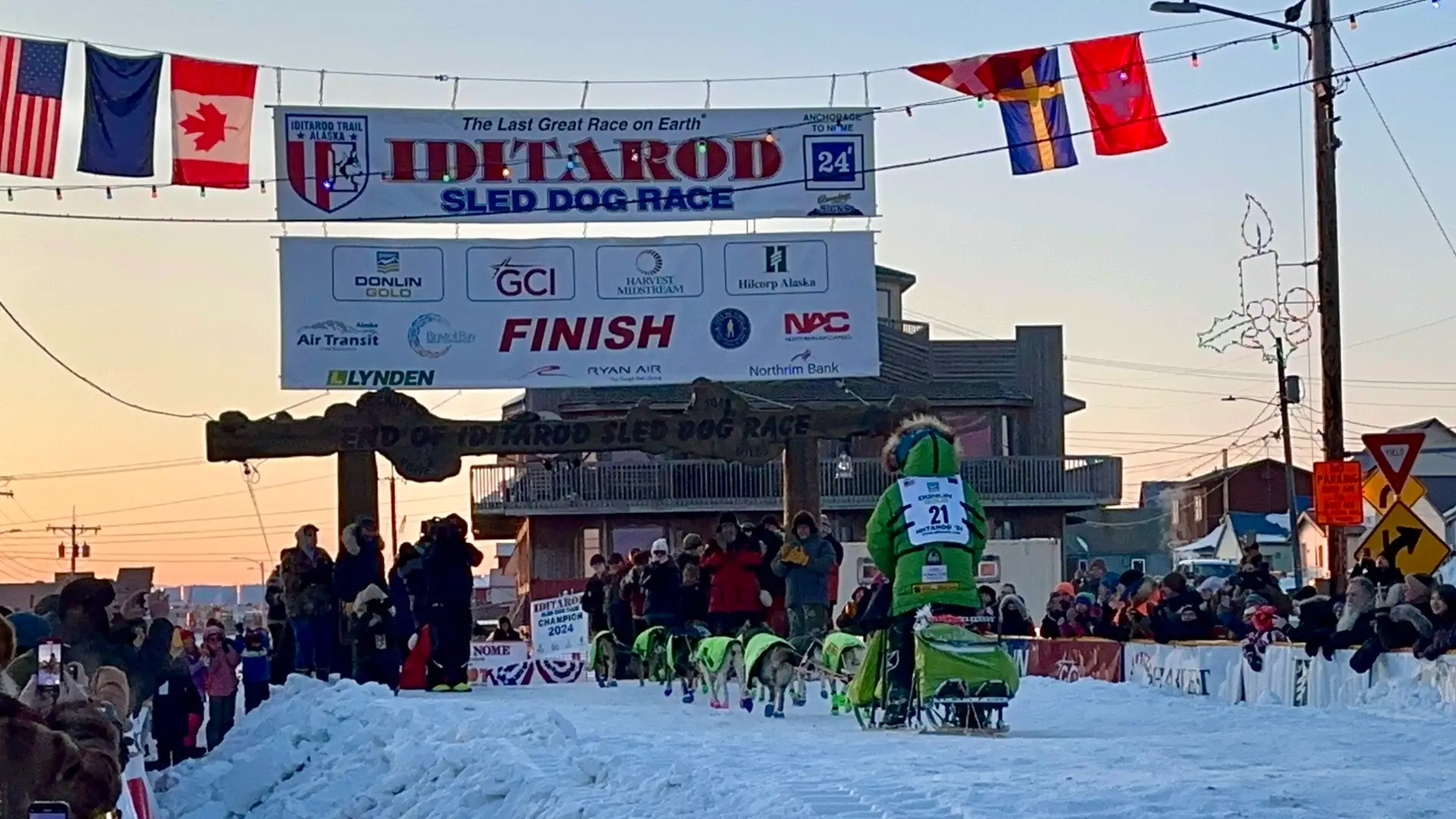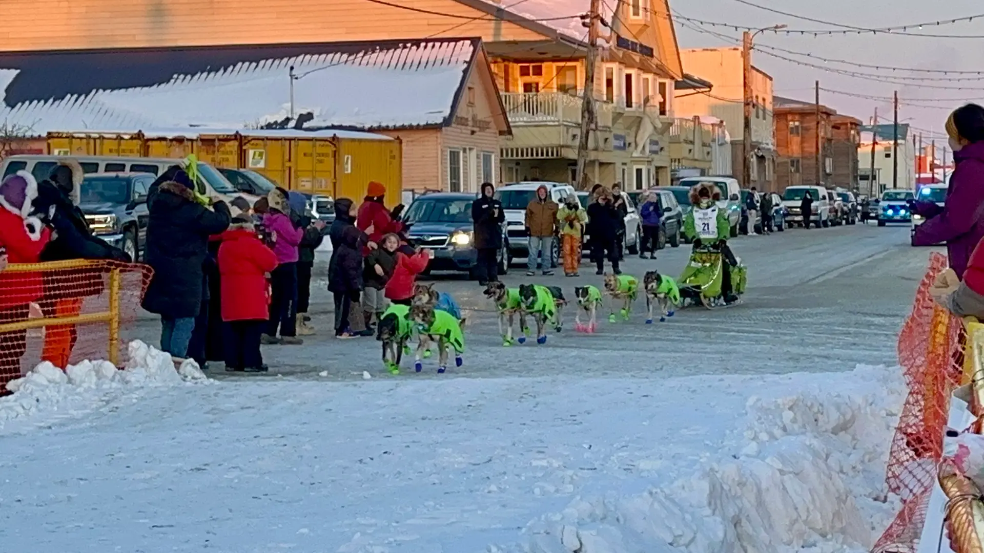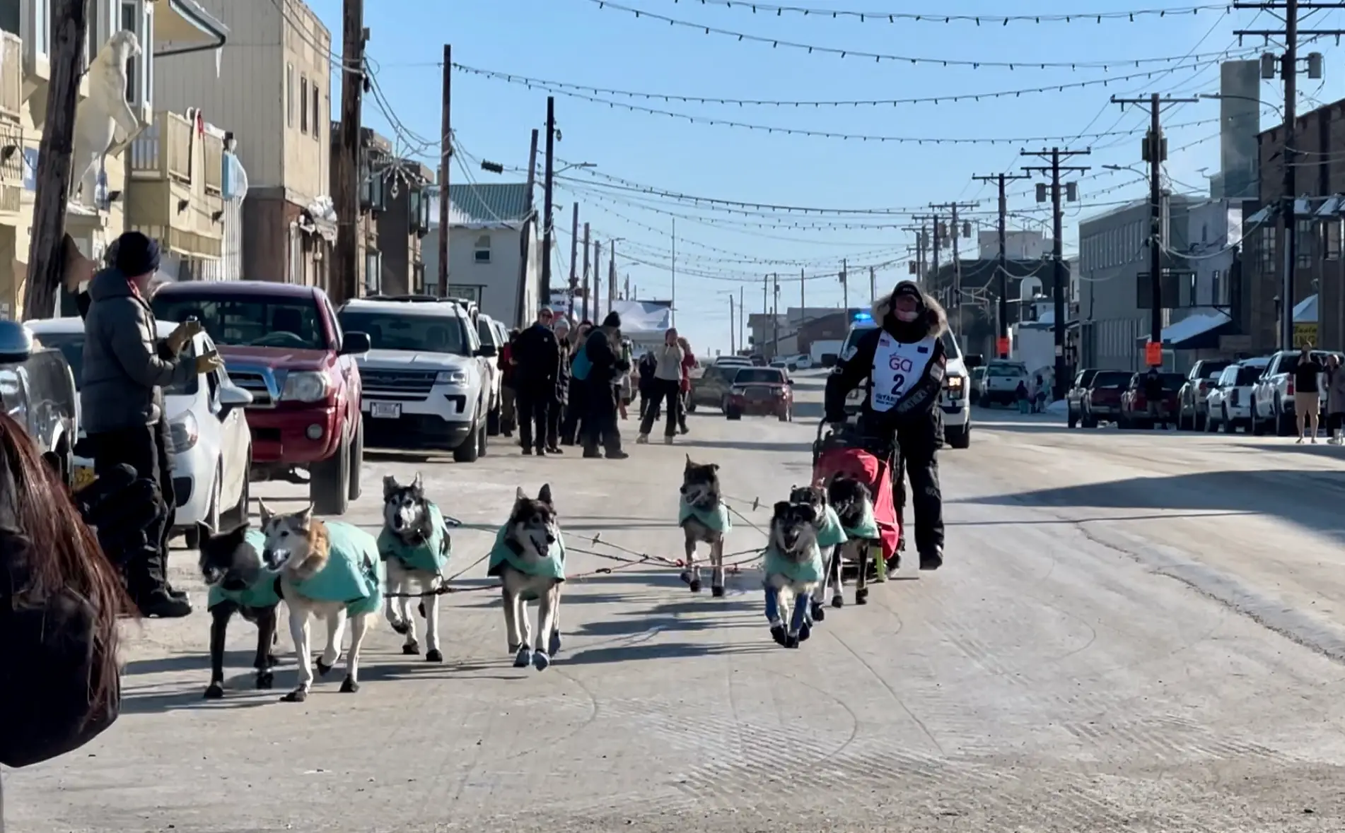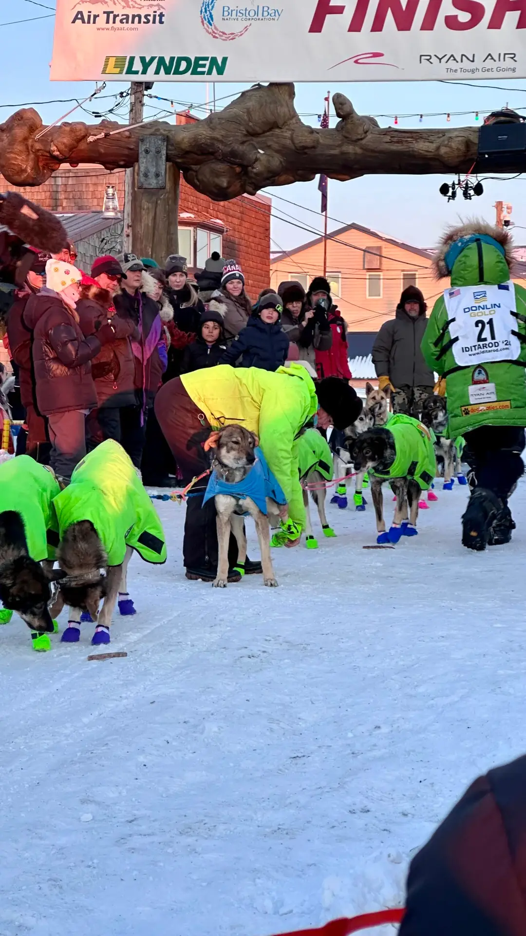 The first musher I witnessed cross the finish line was Ryan Redington in 14th place, just three hours after my arrival. The emergency sirens sounded, and Macy and I headed to the finish line to join others in welcoming Ryan and his dogs to Nome. We anxiously awaited seeing the police cars, sirens blaring, that marked Ryan’s arrival as we listened to his background over the speaker. Like Dallas, Ryan comes from a family of mushers. In fact, his grandfather, Joe Redington, Sr. is known as the “Father of the Iditarod” for starting the Iditarod in 1973. His father is Remy, who raced in the Iditarod 14 times. Ryan himself won the Iditarod in 2023. The anticipation crackled as the team drew nearer. Then, in the distance, we spotted Ryan and his canine crew trailing the police escort. Their approach to the burled arch was amplified by roaring cheers. Ryan’s face was etched with a blend of elation and sheer exhaustion, but his dogs seemed to find a second wind, tails wagging furiously as they finally stopped for praise and pictures.
