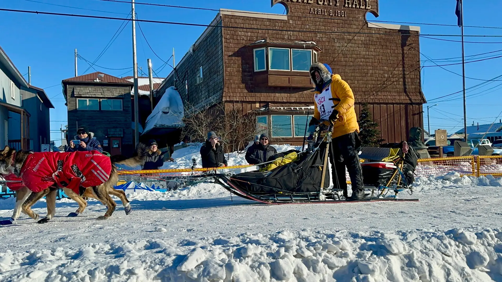 The town of Nome transforms into a 24/7 celebration as the Iditarod reaches its climax. The bars are open 23 hours a day (they close one hour for cleaning), and sleep becomes a luxury, with sirens shattering the night at all hours, heralding another musher’s arrival. This round-the-clock revelry underscores just how deeply the Iditarod pulses through Nome’s veins. As each musher crossed the finish line, I was struck by the reverence they showed their dogs. These furry heroes were lavished with pets, treats, and well-deserved praise, a reminder that the Iditarod is a true partnership between human and canine.  But before mushers can fully embrace their hard-won glory, they must endure a few more elements of the race. First, a gear check. Each musher must carry with them a sleeping bag rated for -20 degrees Fahrenheit, an ax, a pair of snowshoes, musher food, veterinary booklets, and a cooker with pot and fuel. Finally, they grant a brief interview, sharing tales from the trail. Then, it’s off to uninterrupted rest for both dogs and mushers, a chance to recharge before basking in the afterglow of their extraordinary achievement.