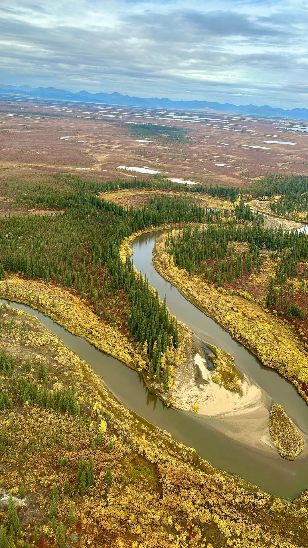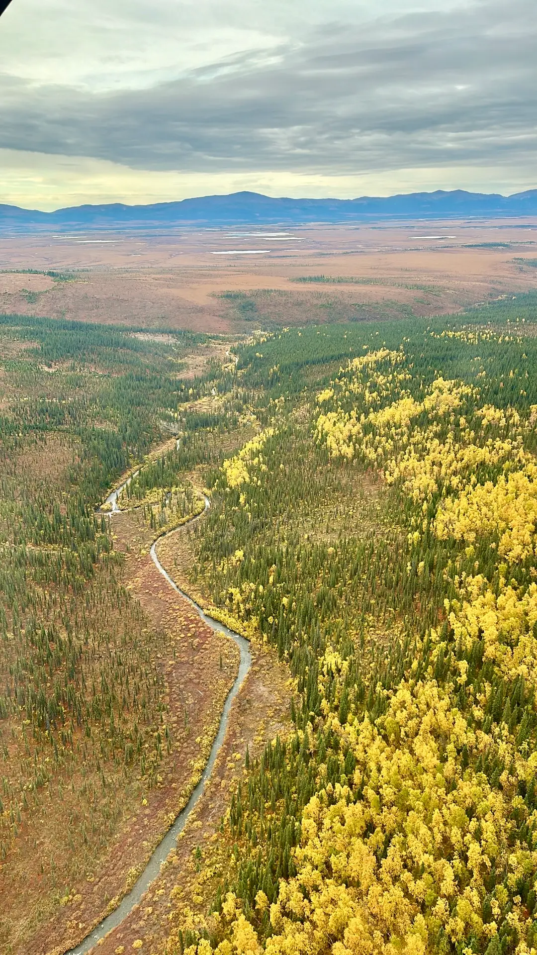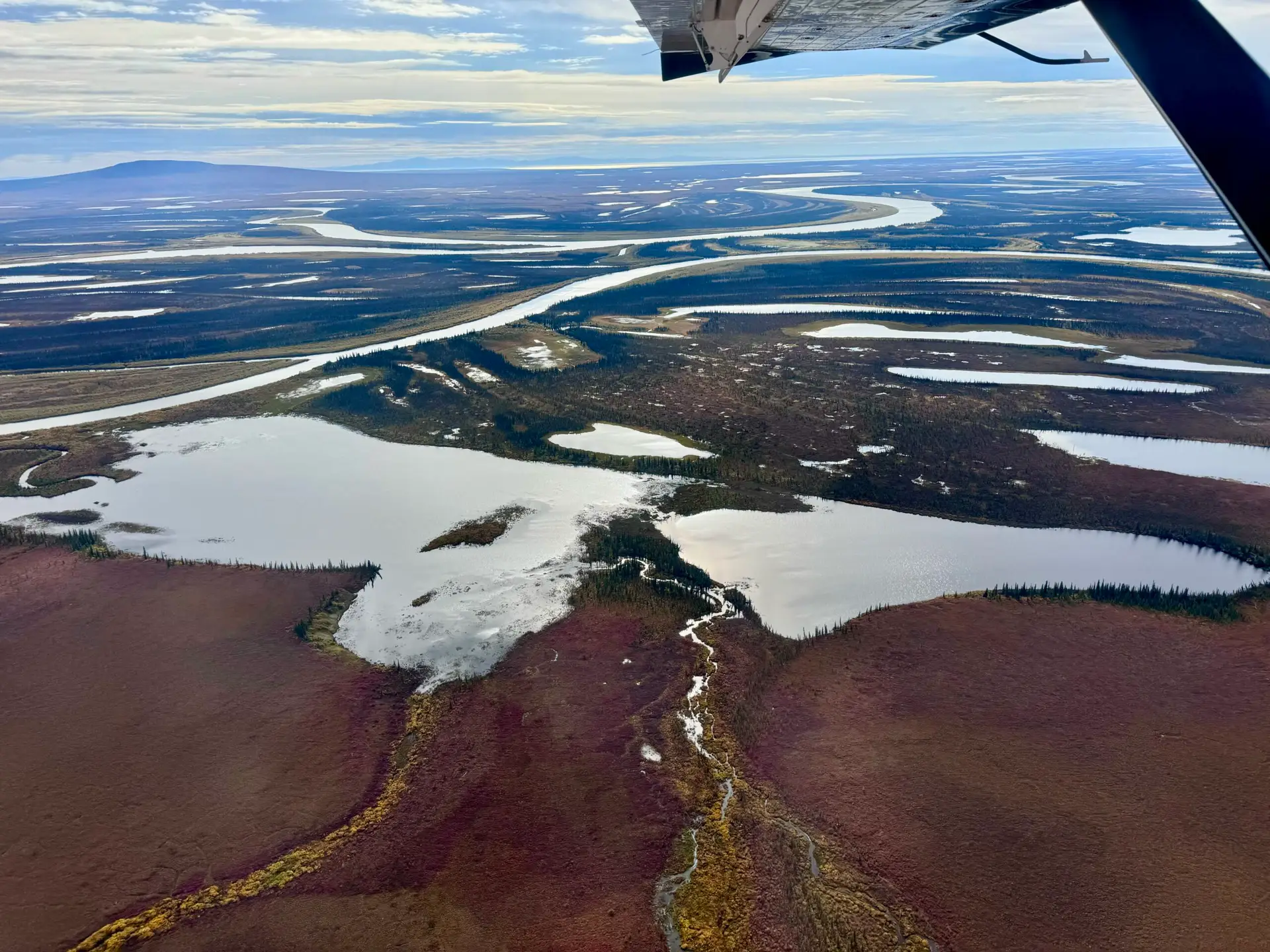 As the engine hummed to life, we lifted off into a world that felt forgotten. We waved goodbye to Kotzebue, and soon the Kobuk River stretched beneath us through a wilderness of gold and rust-colored tundra. Trees dotted the landscape, looking more like toy models than actual giants of the forest. Mountains rose around us, close enough that it felt like you could reach out and touch them through the window. In the distance, we saw the Great Kobuk Sand Dunes, out of place in such a rugged land—a desert within the Arctic. That would be a stop on the way back, but for now, our destination lay farther ahead.