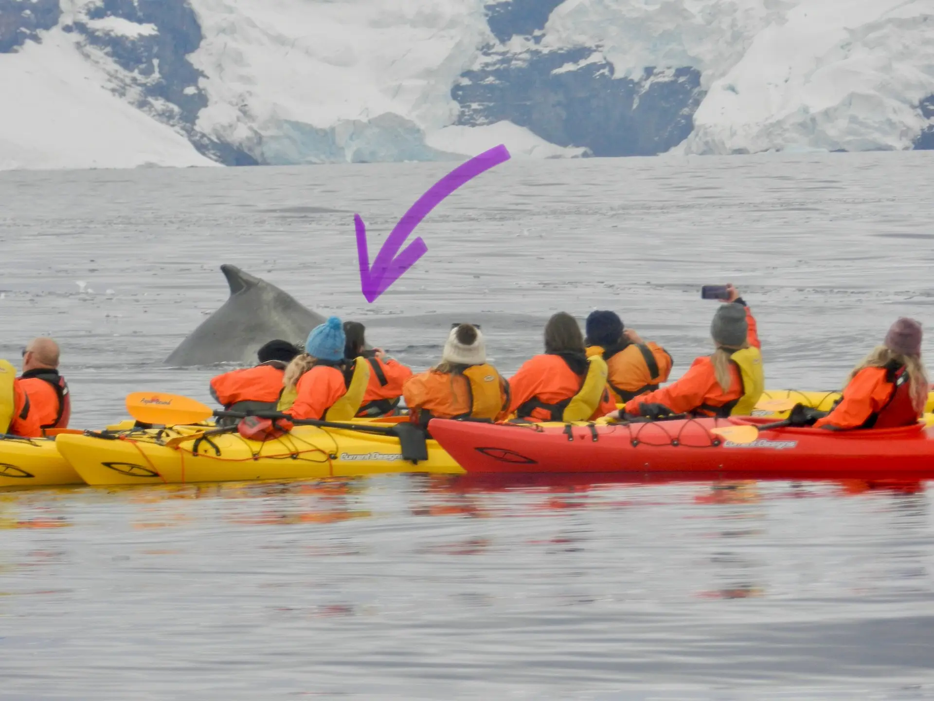 We set off after that to see if we could spot a minke whale that had been seen nearby. But by the time we made it to the area, the whale had moved on. So we turned back, paddling through thick patches of ice again—which, I’ll tell you, is no easy task in a kayak. My arms were already burning, but there was no time to think about that because suddenly our guide got word of humpback whales just up ahead.