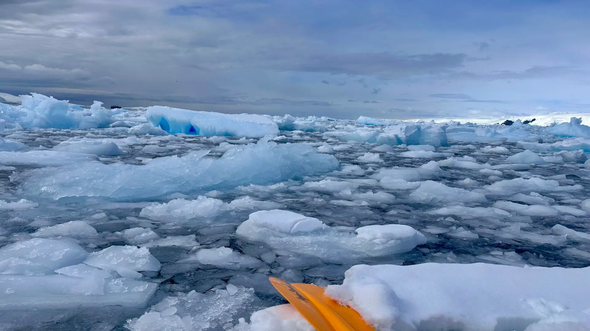 Despite the clouds, the sun broke through just as we reached the bay, casting golden light across the ice. The water sparkled like it had been dusted in glitter, and every iceberg shimmered in the sunlight. We carefully transferred into the kayaks and pushed off into this surreal, icy dreamscape.