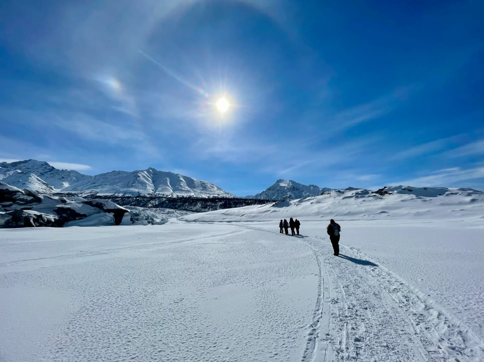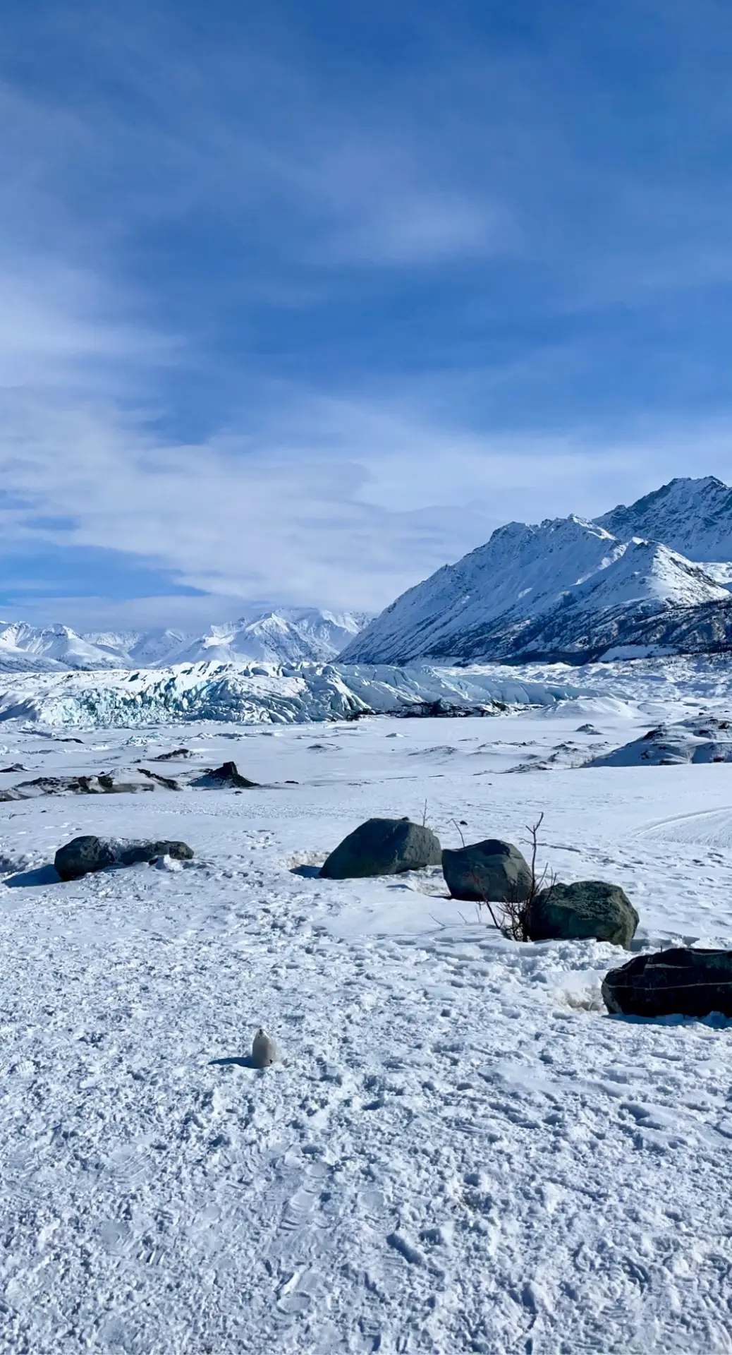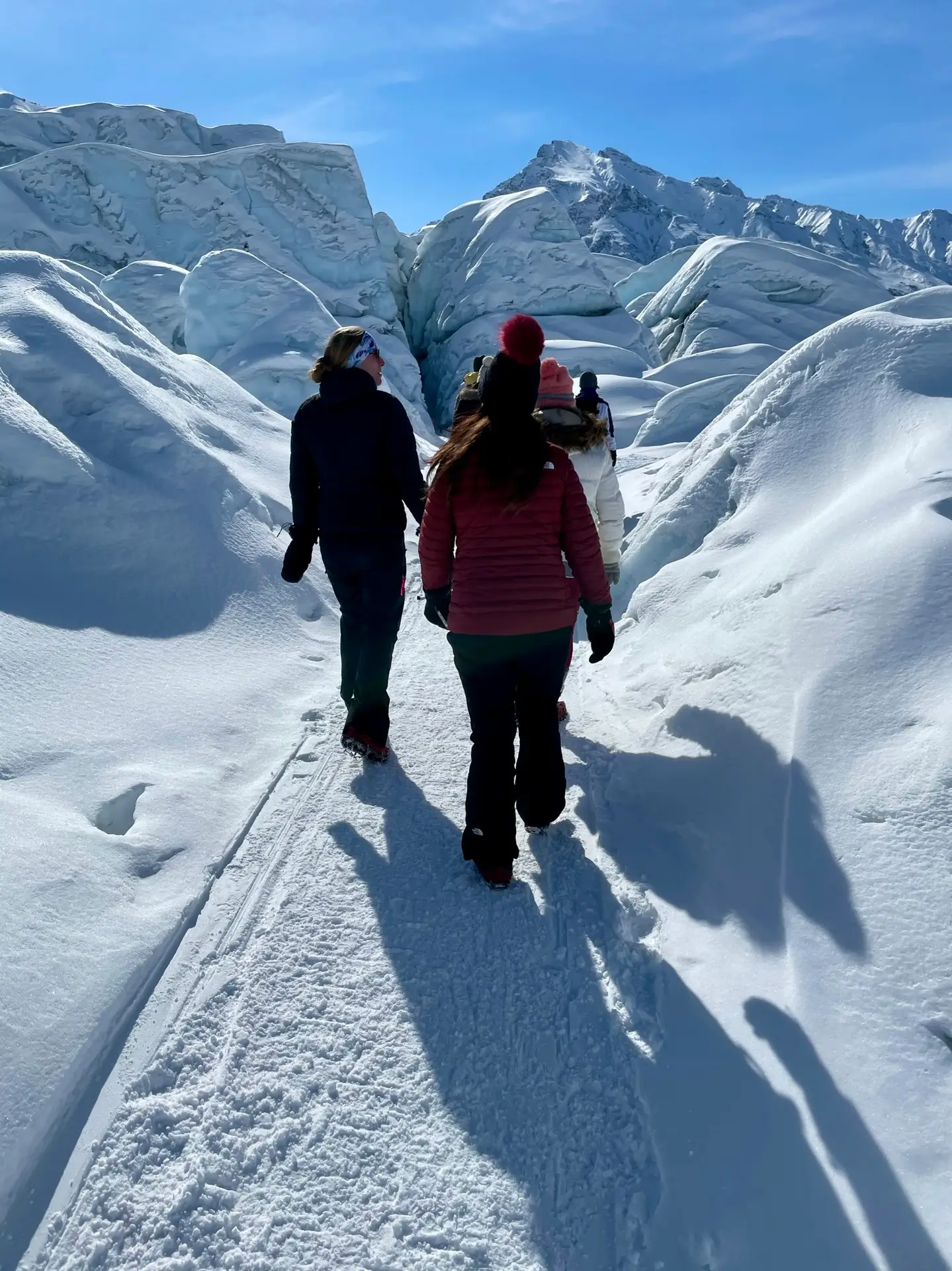 The tour started with a snowmobile/sled ride (yes, yes, snow machine to you Alaskans) to get us up close and personal with the glacier. From there, we set off on foot. As we approached the glacier, its sheer size took our breath away. Matanuska Glacier stretches approximately 27 miles and covers an astounding 26 square miles. We were immediately captivated by the brilliant blue ice, intricate crevasses, and towering ice formations that greeted us. Equipped with crampons, we hiked across the icy expanse, discovering hidden crevasses and enjoying panoramic views of the surrounding landscape.