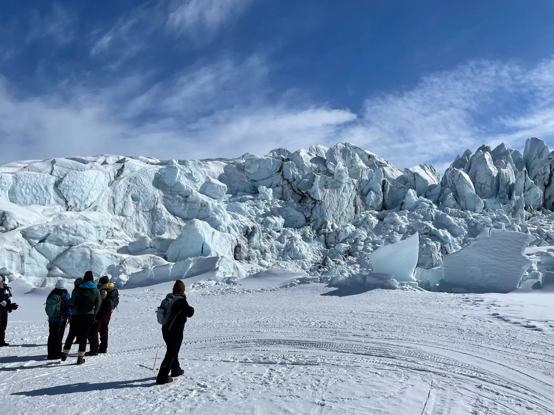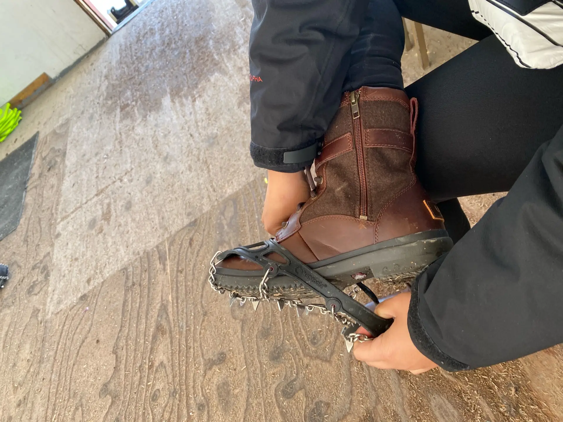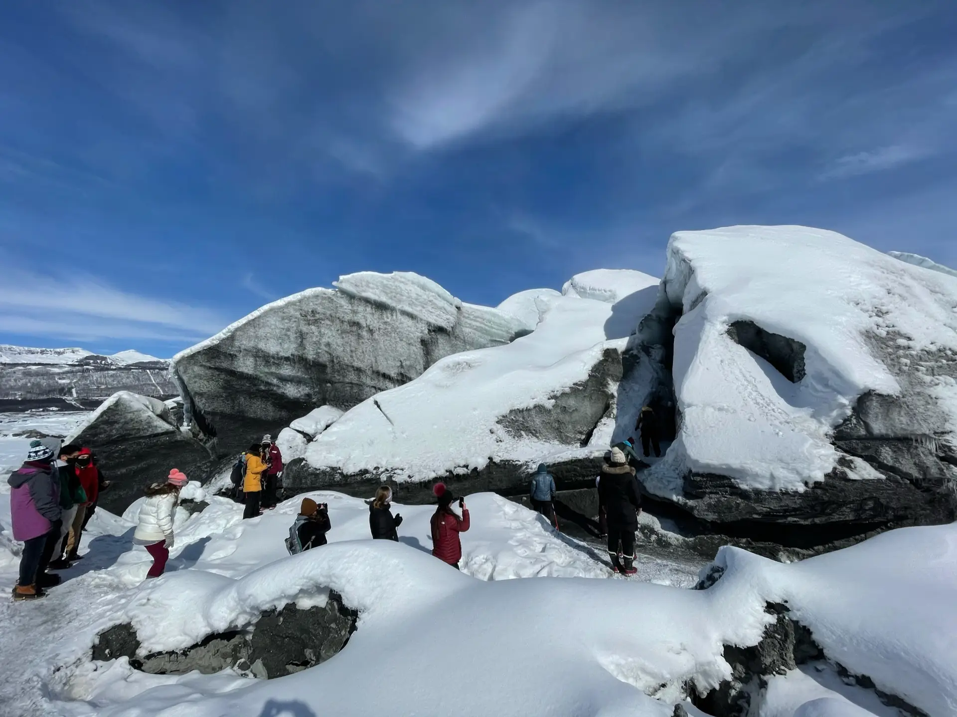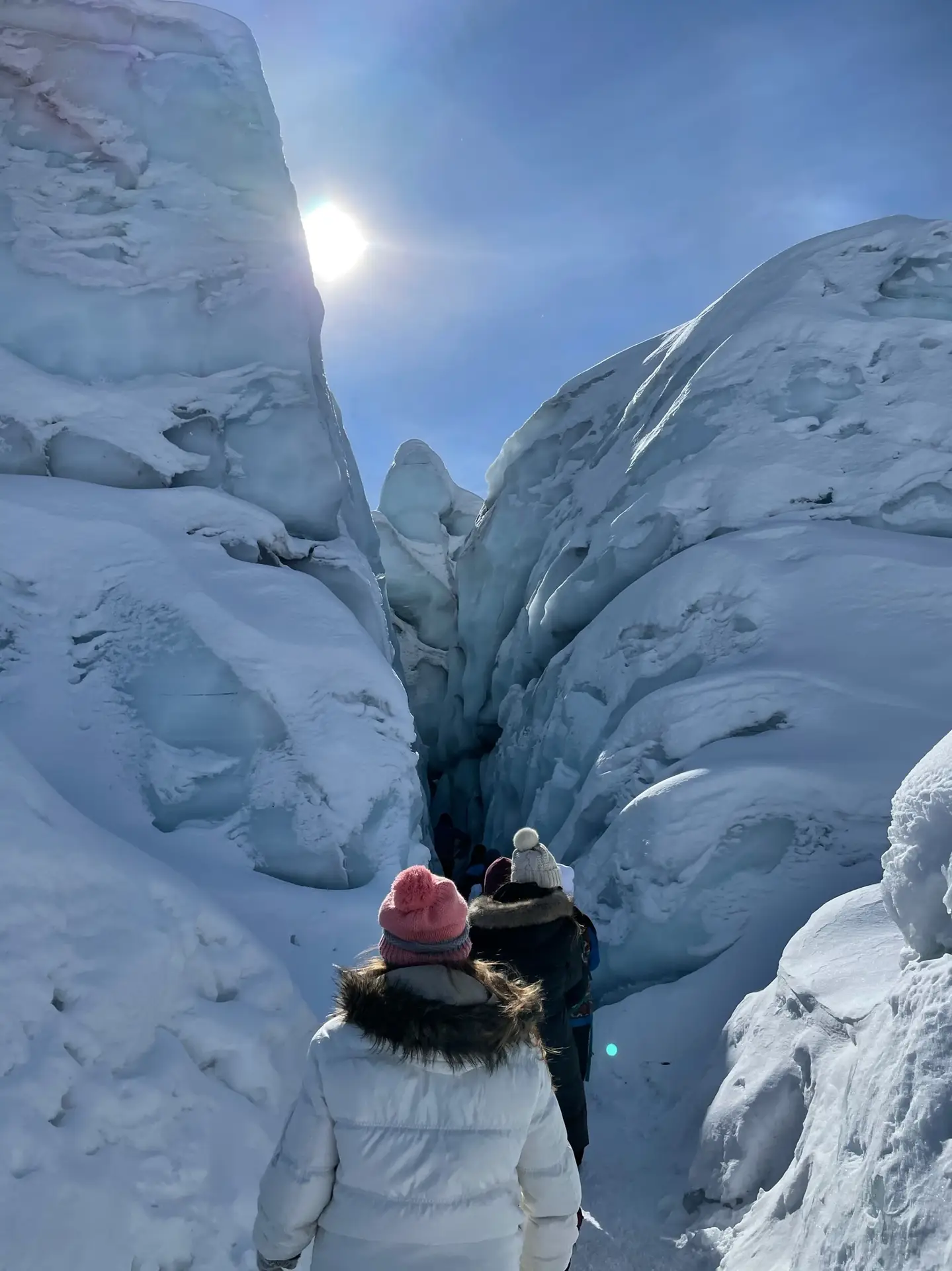 We first stopped at the gift shop, where we checked in and paid for our tour. Because it was winter, the only way to safely venture onto the glacier’s surface is by guided tour, so that’s what we did. From there, we were sent a little further down the road to the place where we would sign our waivers, get our crampons, and start the tour. Even from a distance, the glacier looked like a scene straight out of Superman.