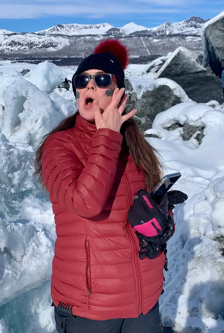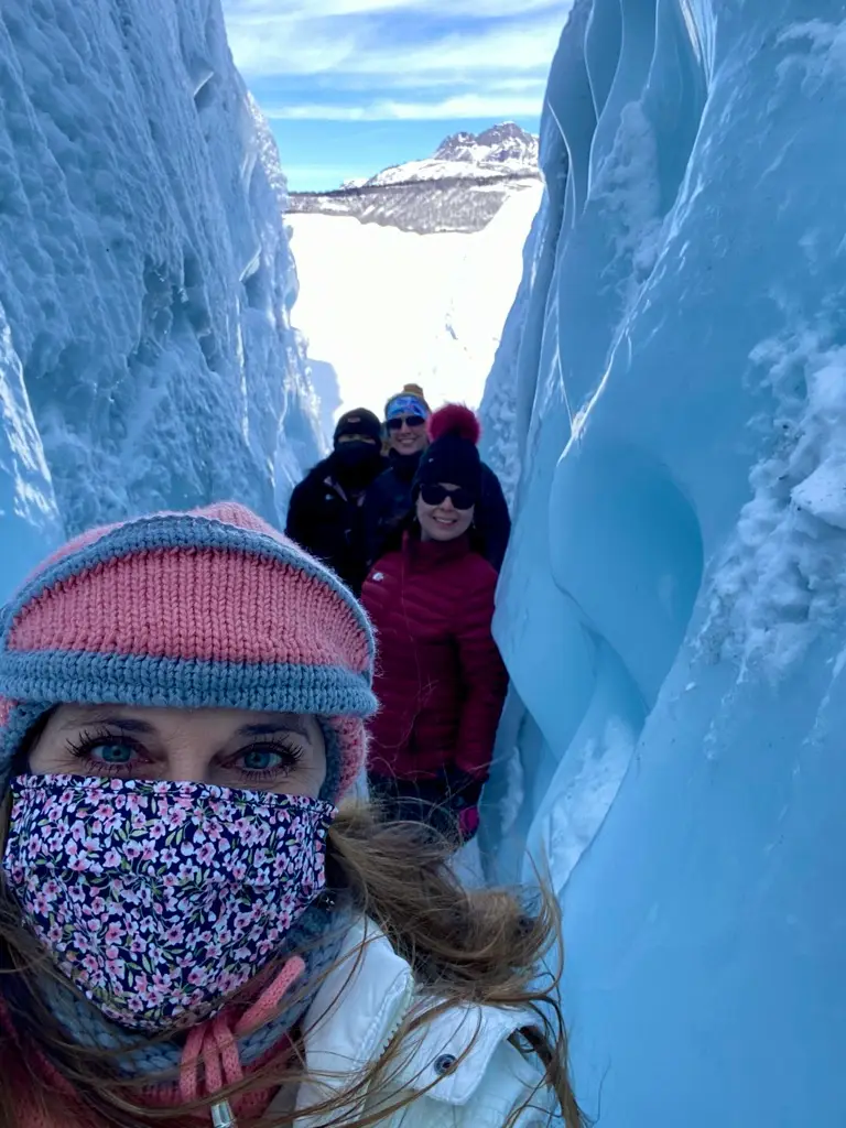 area we were in was safe, so we all tasted the fresh glacier water.  Krystal also treated herself to a glacial mud mask – glacier mud typically contains minerals (such as silica, magnesium, calcium, and potassium, which can help nourish and revitalize the skin), nutrients, and organic materials.  As glacier mud dries, it may draw out impurities from the skin, unclog pores, and exfoliate dead skin cells.  This can leave the skin feeling refreshed, smoother, and more radiant.