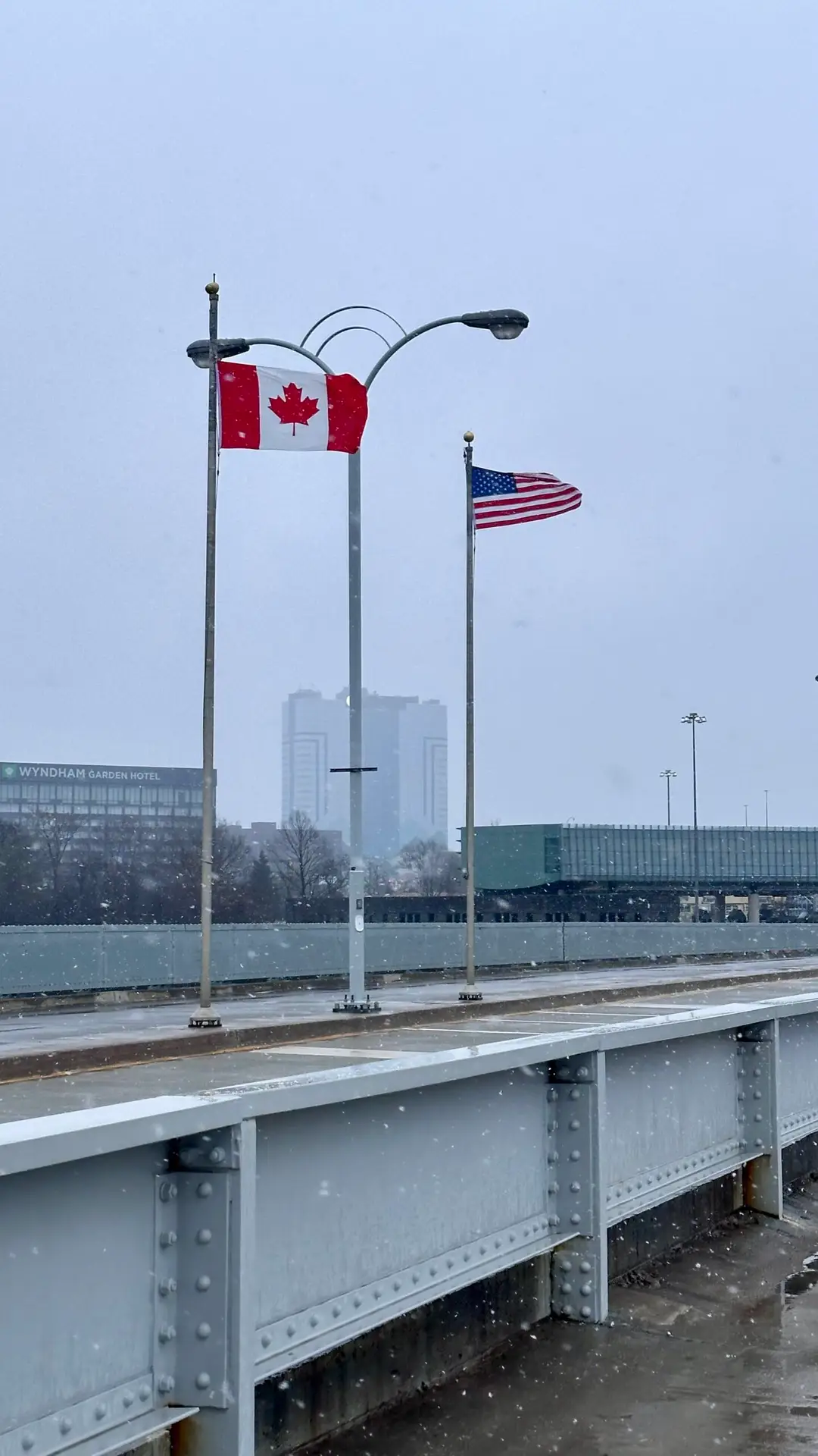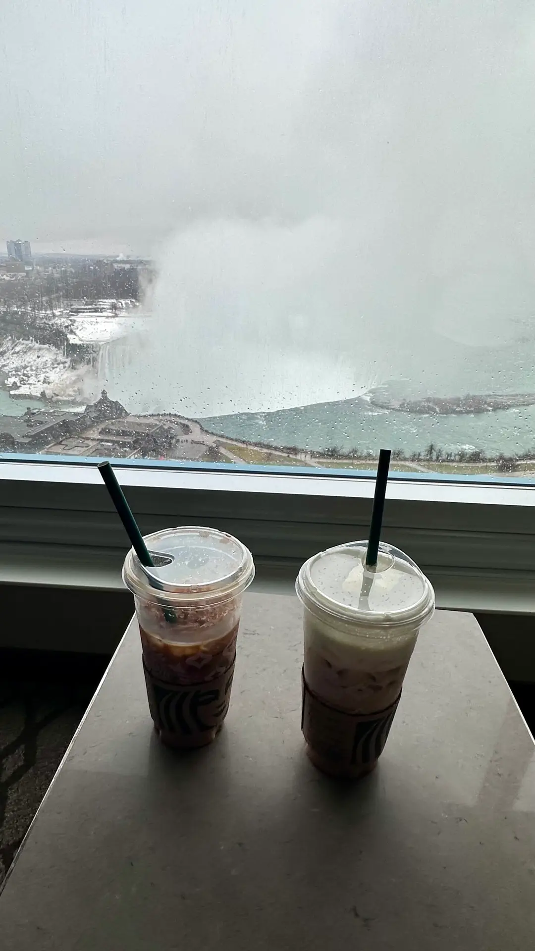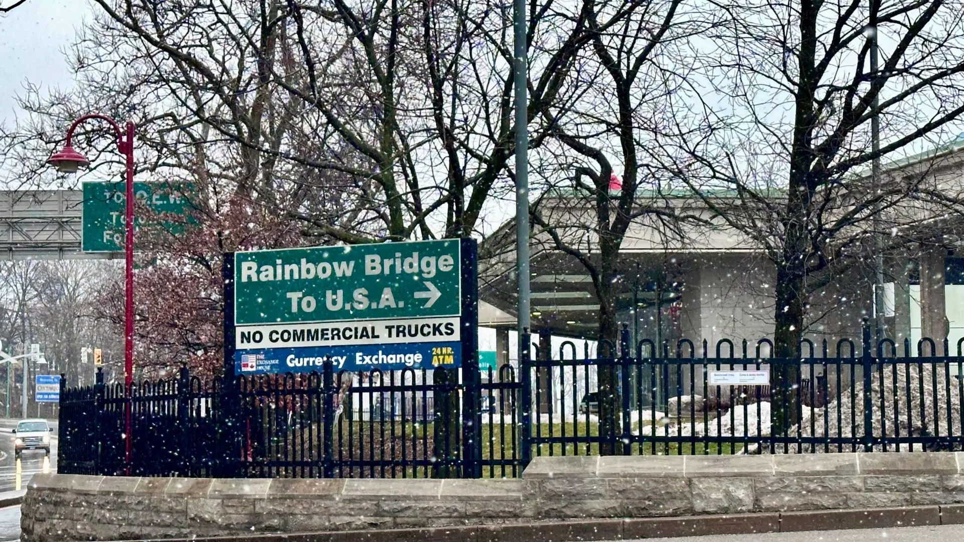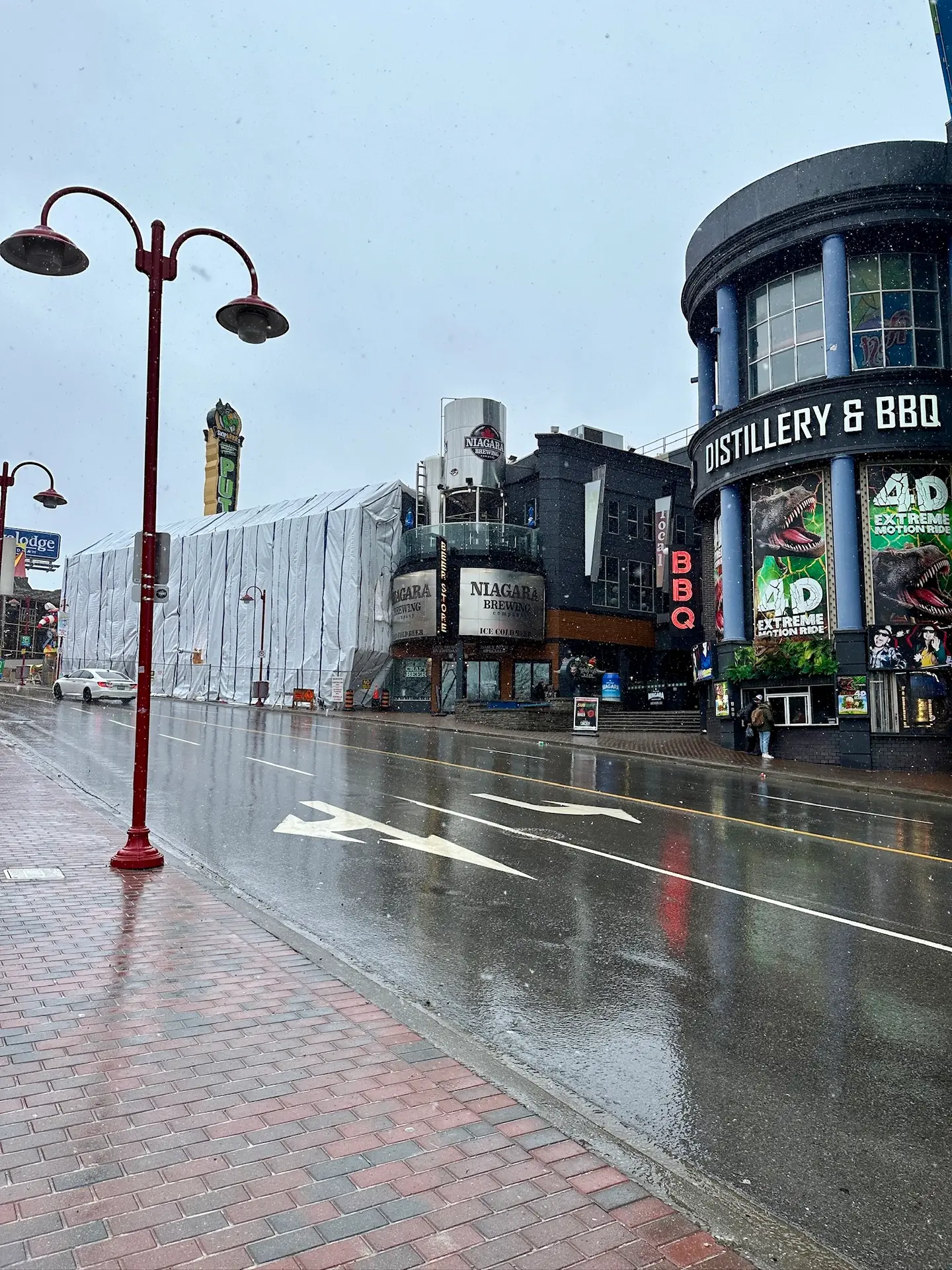 The next morning greeted us with a blanket of fog outside our window – it was pure white, but we didn’t let it dampen our spirits. After grabbing some coffee and seeing the fog begin to lift, we savored our drinks with a view before leaving on a leisurely stroll along the picturesque Niagara Parkway. As the day progressed, the weather took a turn, with light rain morphing into heavy snowflakes, which was great because I’ll take cold and snow any day over cold and rain! Our walk led us to the Rainbow Bridge, where we had the pleasure of meeting Reg, a local candy shop owner who shared tips that we didn’t know we needed for crossing the bridge, such as how to get up to the bridge and that we needed a few Canadian coins – loonies, according to