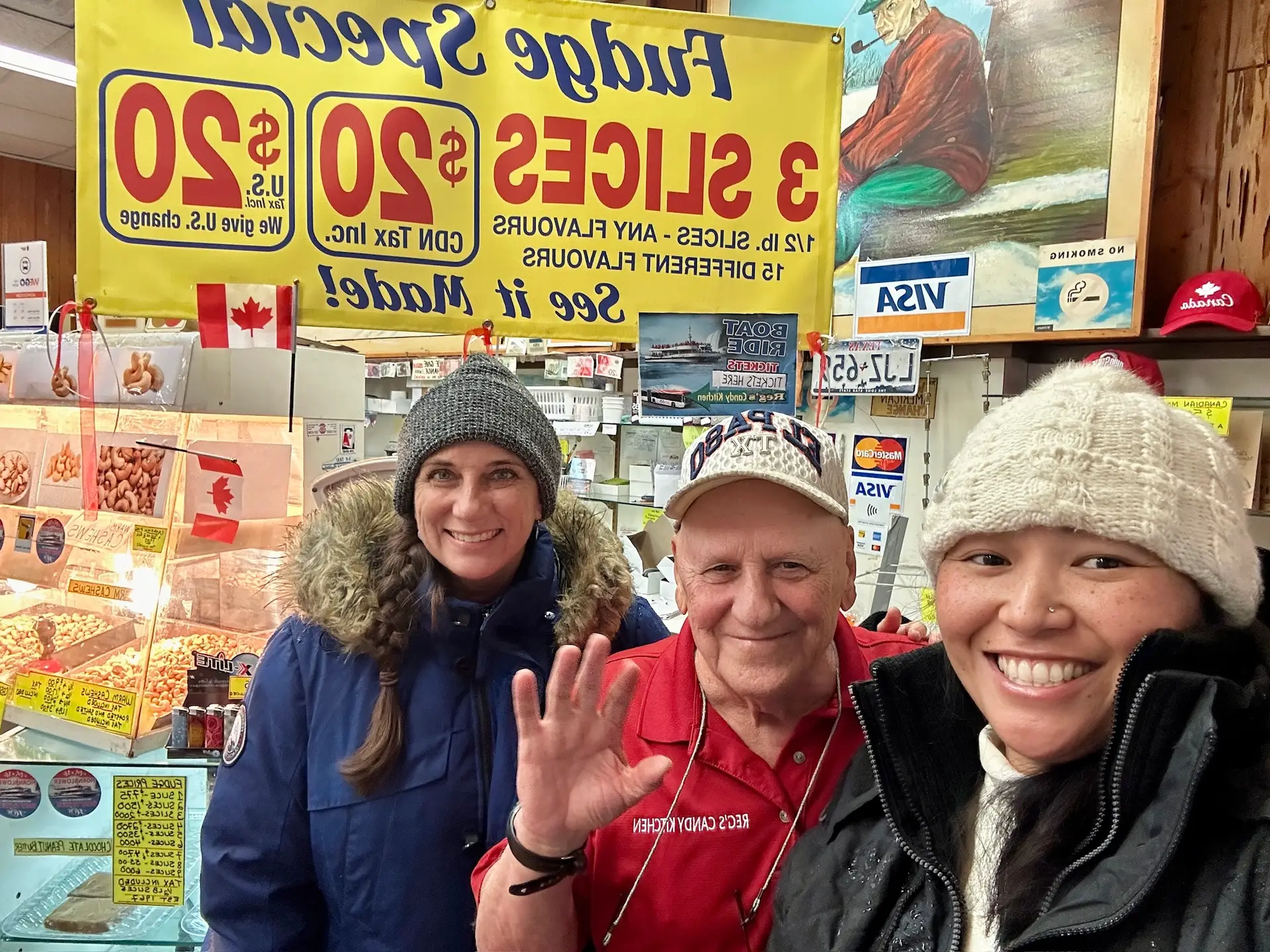 Reg, a term that we learned they don’t use in Quebec. Reg has owned his little candy shop since 1967 when he was 18 years old, and he makes his own fudge daily. We chatted with Reg for a bit, and then made our way to the middle of the bridge where we were all too excited to take pics with a foot in each country.