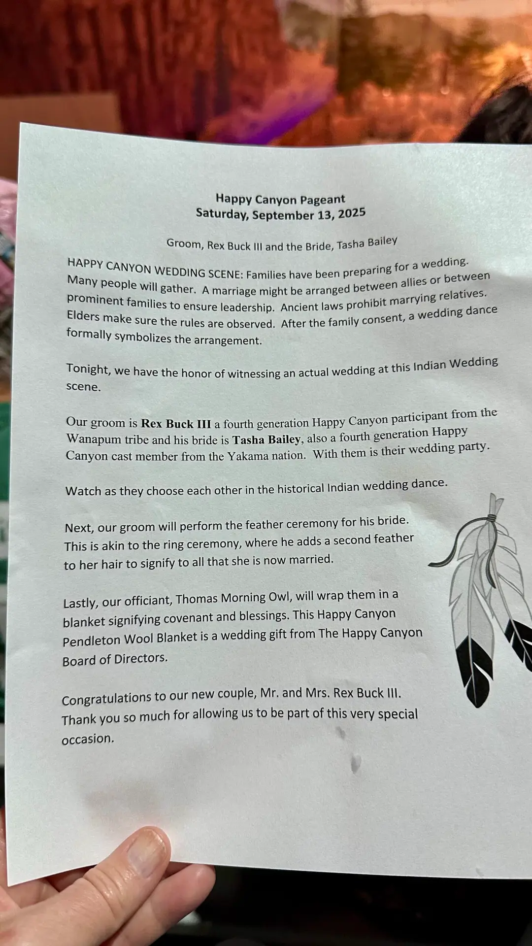Rex Buck III, a fourth-generation Happy Canyon participant from the Wanapum tribe, married Tasha Bailey, also a fourth-generation cast member from the Yakama Nation. The ceremony blended tradition and celebration: a feather ceremony in place of rings, a covenant blessing with a Pendleton wool blanket, and the historical Indian wedding dance. Sitting in the audience, I realized I wasn’t just watching a performance—I was witnessing living history. It gave the night show a depth and authenticity I’ll never forget.