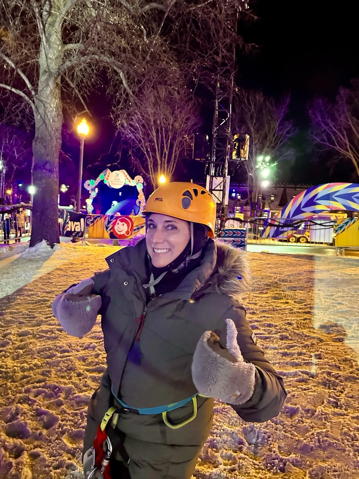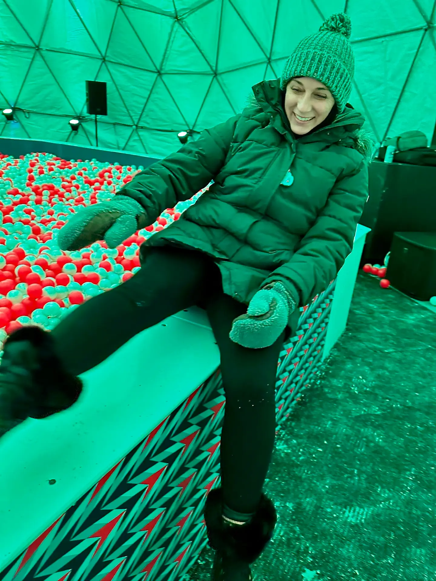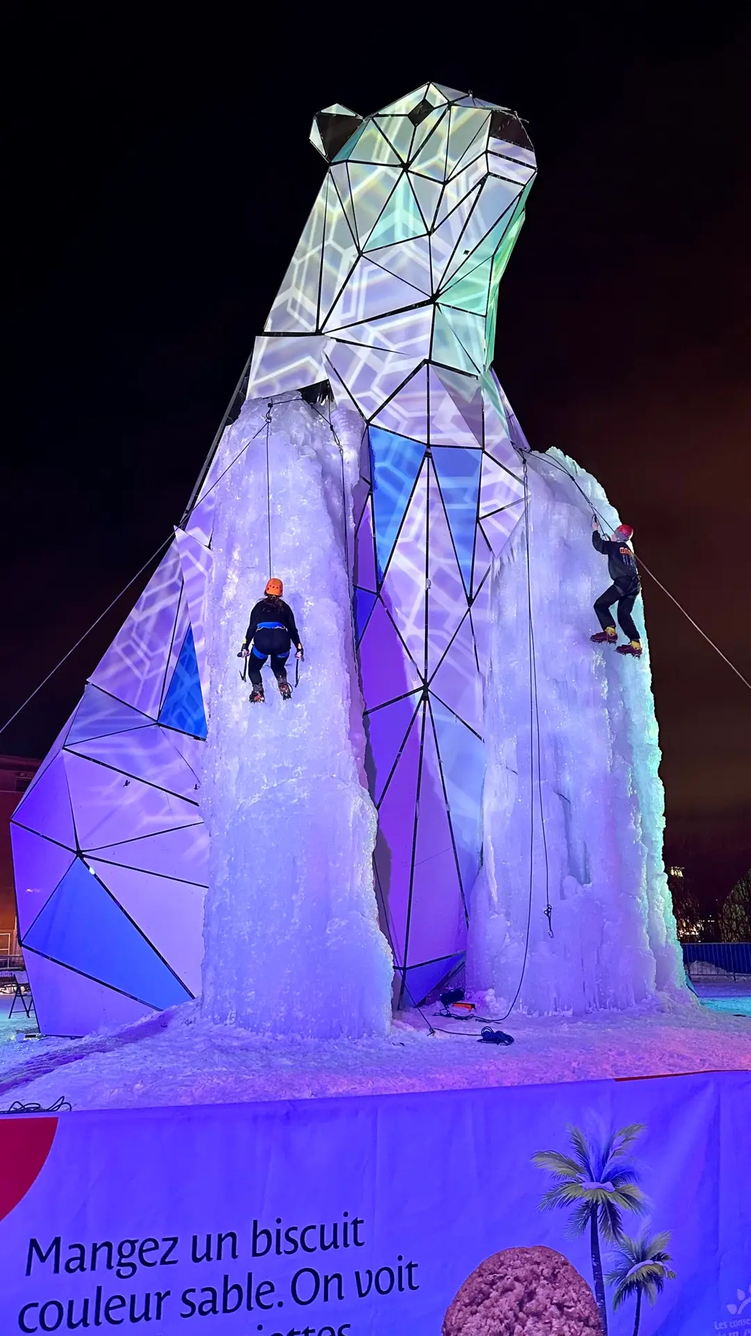 At the heart of the Winter Carnaval lies a rich tapestry of activities and events that showcase the unique spirit and heritage of Quebecois culture. Despite our eager participation in numerous activities, the depth and breadth of the event left us feeling as though we had barely skimmed its surface. Our first day was a sensory feast, as we were entranced by all of the ice sculptures scattered around the city, each crafted with meticulous precision. Our exploration led us to a toboggan ride, where the crisp air buzzed with anticipation as we waited patiently in line for this unique ride. As night approached, we were swept away by the carnival’s nighttime parade – an extravaganza of choreographed performances, large-scale moving animations, and mesmerizing music and light shows. From acrobats jumping on trampolines to human candlesticks, the parade ignited both our senses and our imaginations, leaving an indelible imprint on our memories. Following the parade, we ventured into one of the carnival setups that featured a large climbing wall shaped like a polar bear that you could even ice climb on, a tube slide, tri-skis, mini-golf with hockey sticks, a ball pit, live music, a fire pit, and at every carnival event site – a bar.