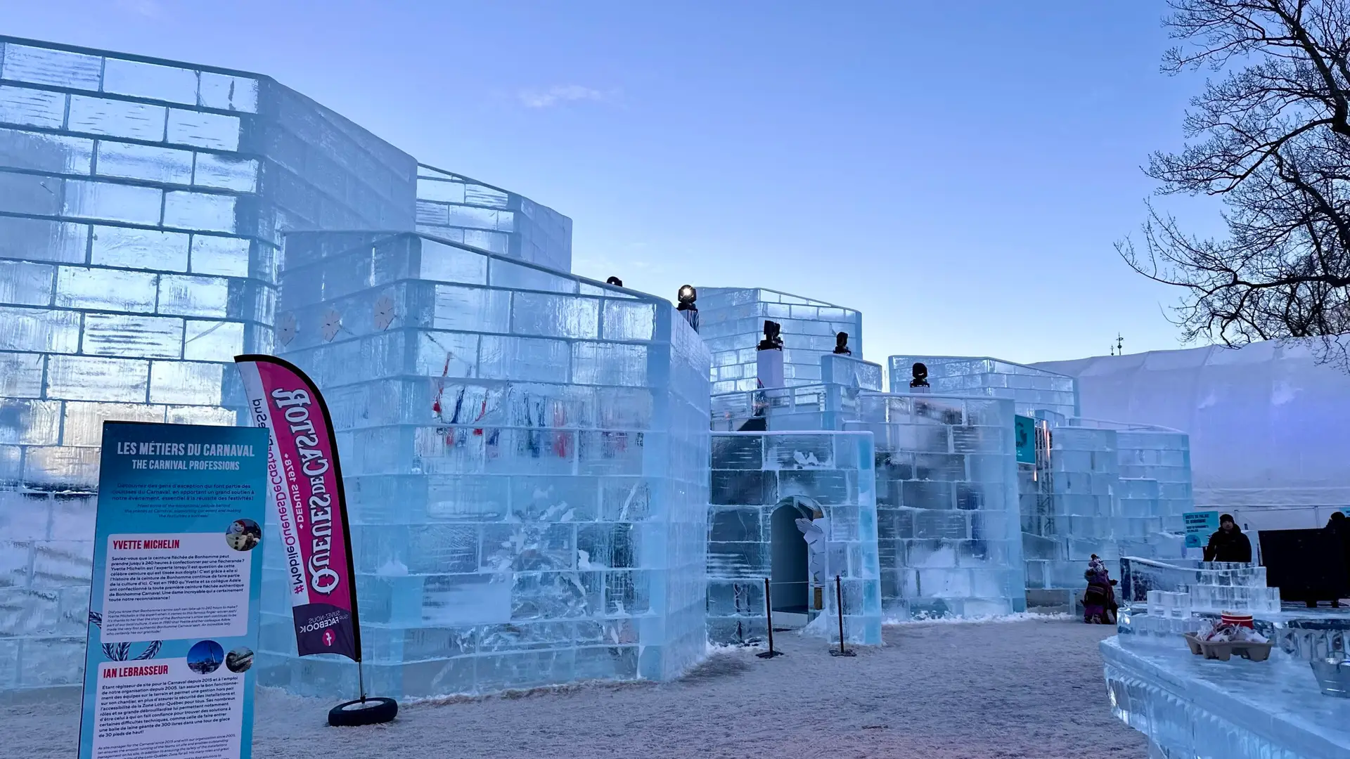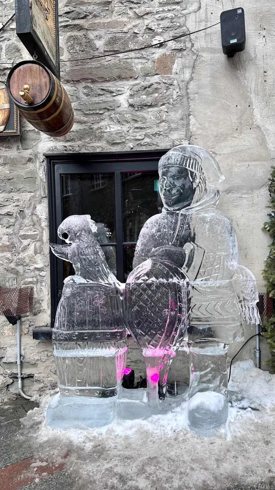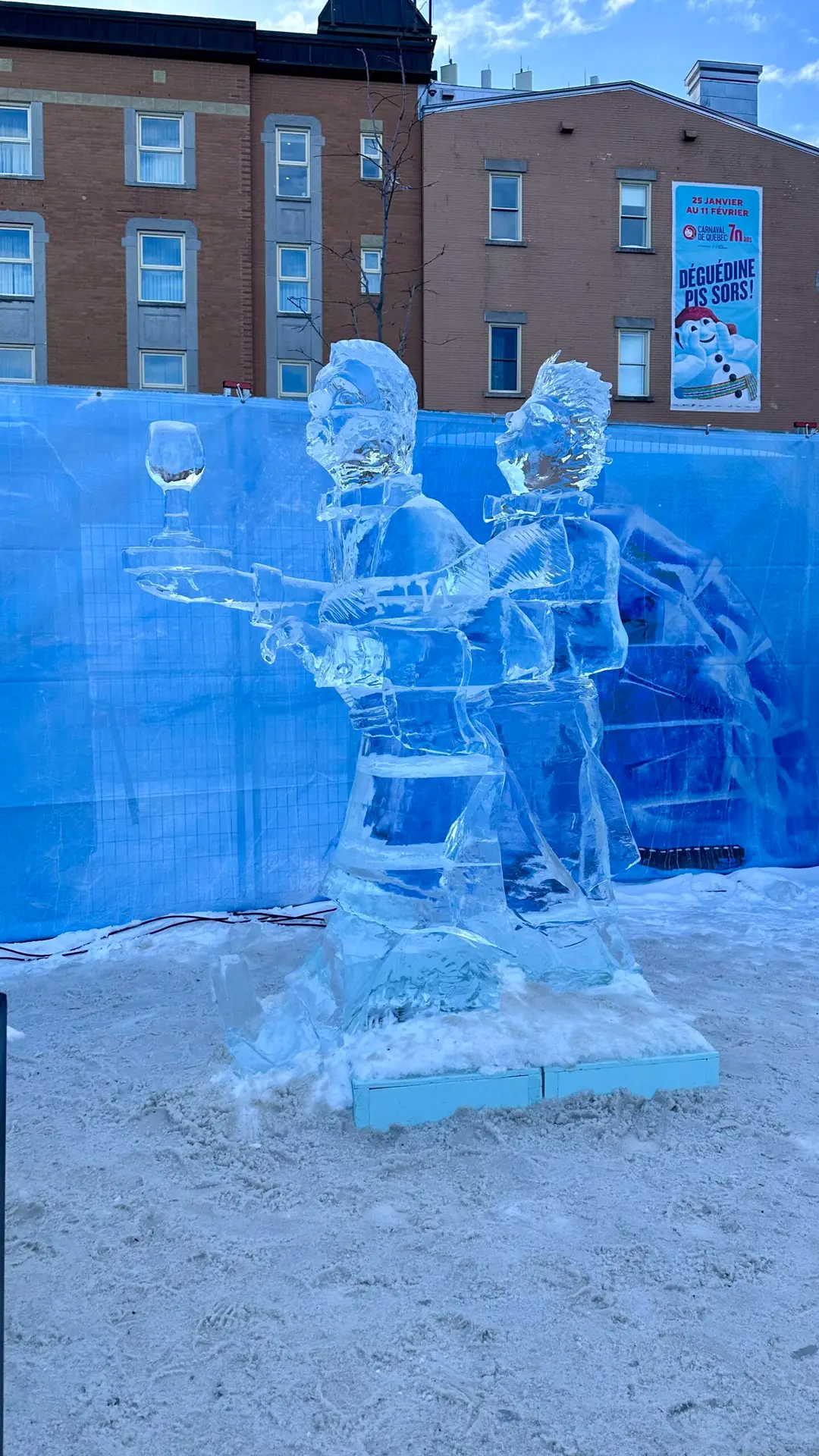 Our final day in Quebec, as serendipity would have it, we stumbled upon the ice castle that we had been looking for as well as two other exciting carnival areas. Bonhamme’s castle was a frozen splendor! His icy castle has been a part of the Winter Carnaval since 1954. Over the course of five weeks, a staggering 600,00 pounds of snow and ice are meticulously sculpted into an architectural marvel that is as fleeting as it is inspiring; it is demolished in a single day at the end of Carnaval. The architecture of the castle changes with the theme of the carnival every year. Another carnival sight featured an igloo and other ice sculptures, complete with artists actively working on bringing more frozen creations to life. Nearby, another inviting ice bar beckoned. At this bar, we were introduced to the delightful Maple Cream Whiskey, unfortunately reserved exclusively for Quebecois palates at this time. A third realm of icy delight this day offered even more Quebec entertainment – a comedy show, albeit in French, an ice slide, a zipline, a silent disco, live music, and yet another ice bar.