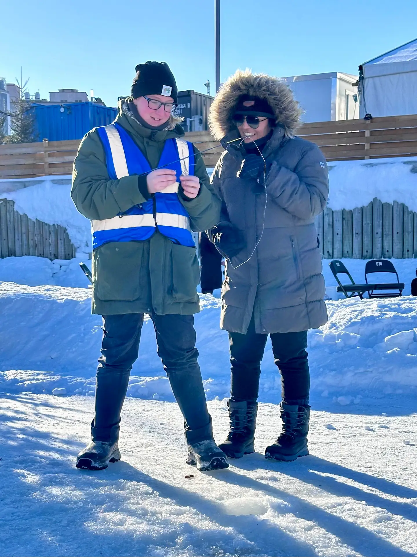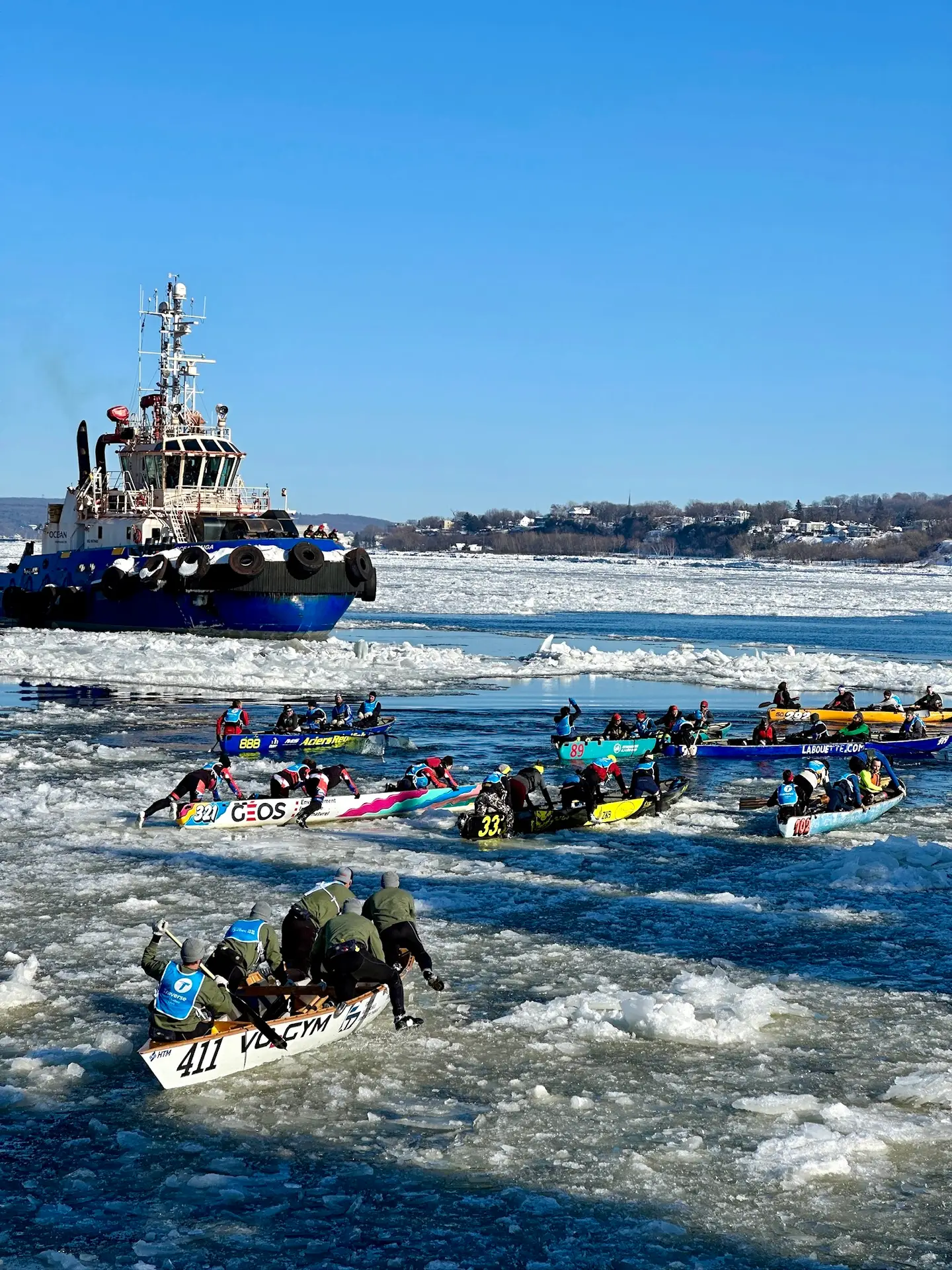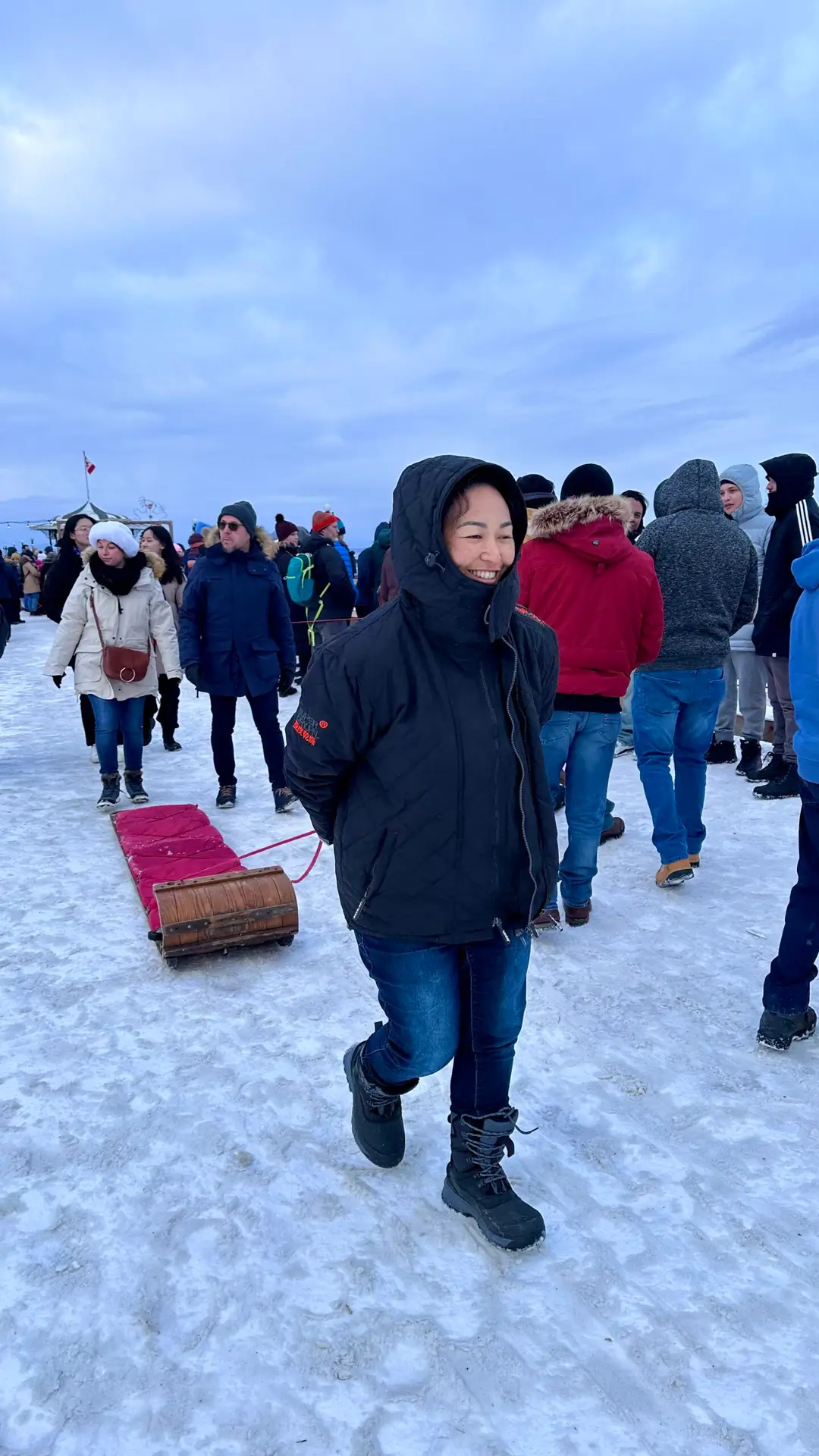 The next day we got to see the canoe race and do some ice fishing. As we arrived at the canoe race, the sounds of cheering crowds echoed against the icy St. Lawrence River. The canoe race, a time-honored tradition dating back to the carnival’s inception in 1955, unfolded in a flurry of paddles and determination! Once crafted from sturdy wood, today’s canoes are made of fiberglass and are much lighter. The race takes the teams up the St. Lawrence River, navigating first over solid ice, then over water with icebergs to dodge, and back over the solid ice again. It is a popular event with many teams and many, many people there to cheer them on. The ice fishing setup was especially exciting for Tiff. They put 3,000 trout in the water for people to catch, and while the trout were rather elusive, the thrill of the chase and the camaraderie of fellow anglers was enough for Tiff. This day, we also indulged in maple syrup taffy, a tantalizing treat for the taste buds. With maple syrup drizzled over snow or ice chips, we watched the transformation as the syrup hardened into a sticky confection. We rolled our popsicle sticks over the sticky taffy, creating a maple taffy lollipop that certainly left us wanting more – yum!