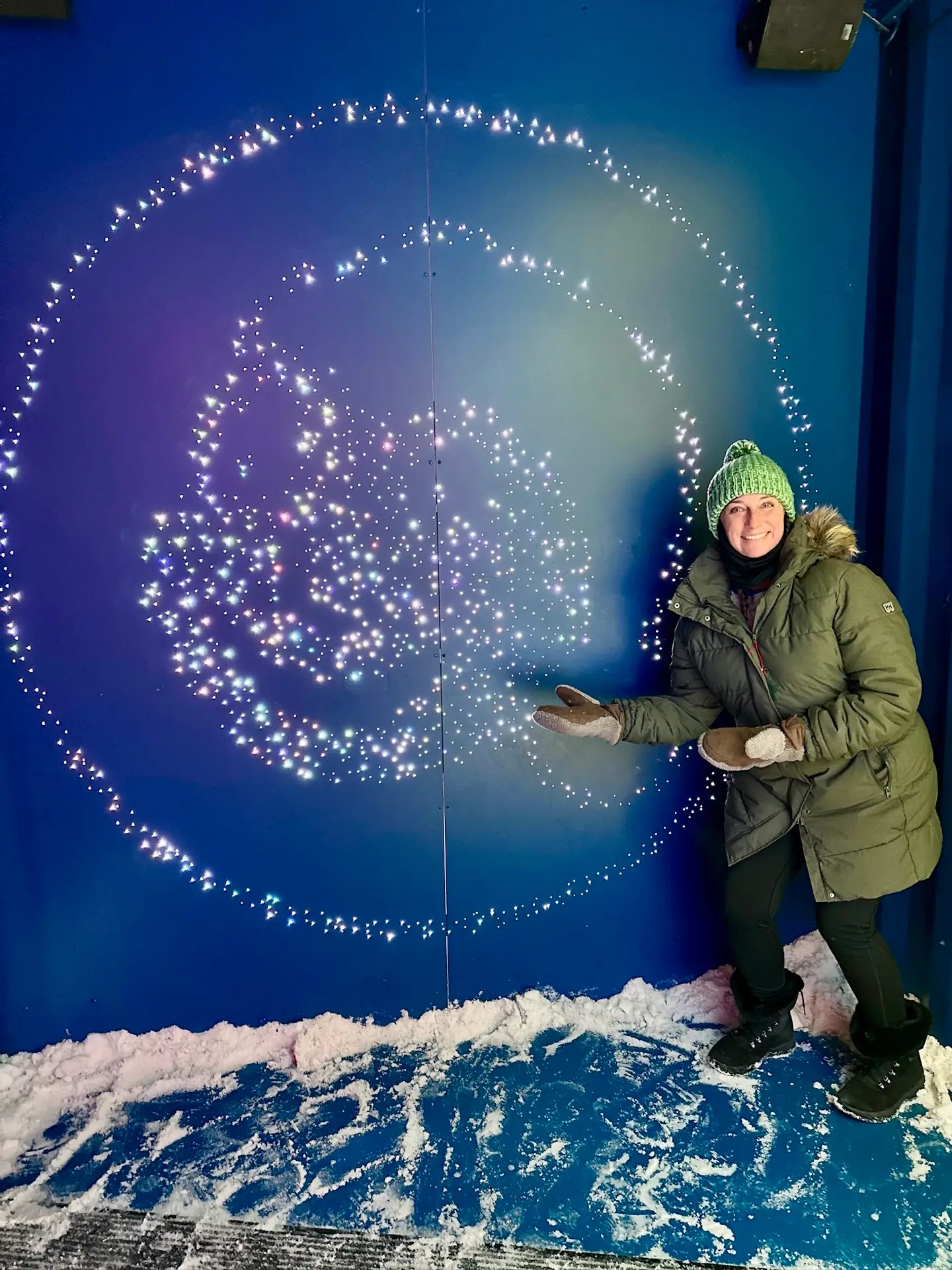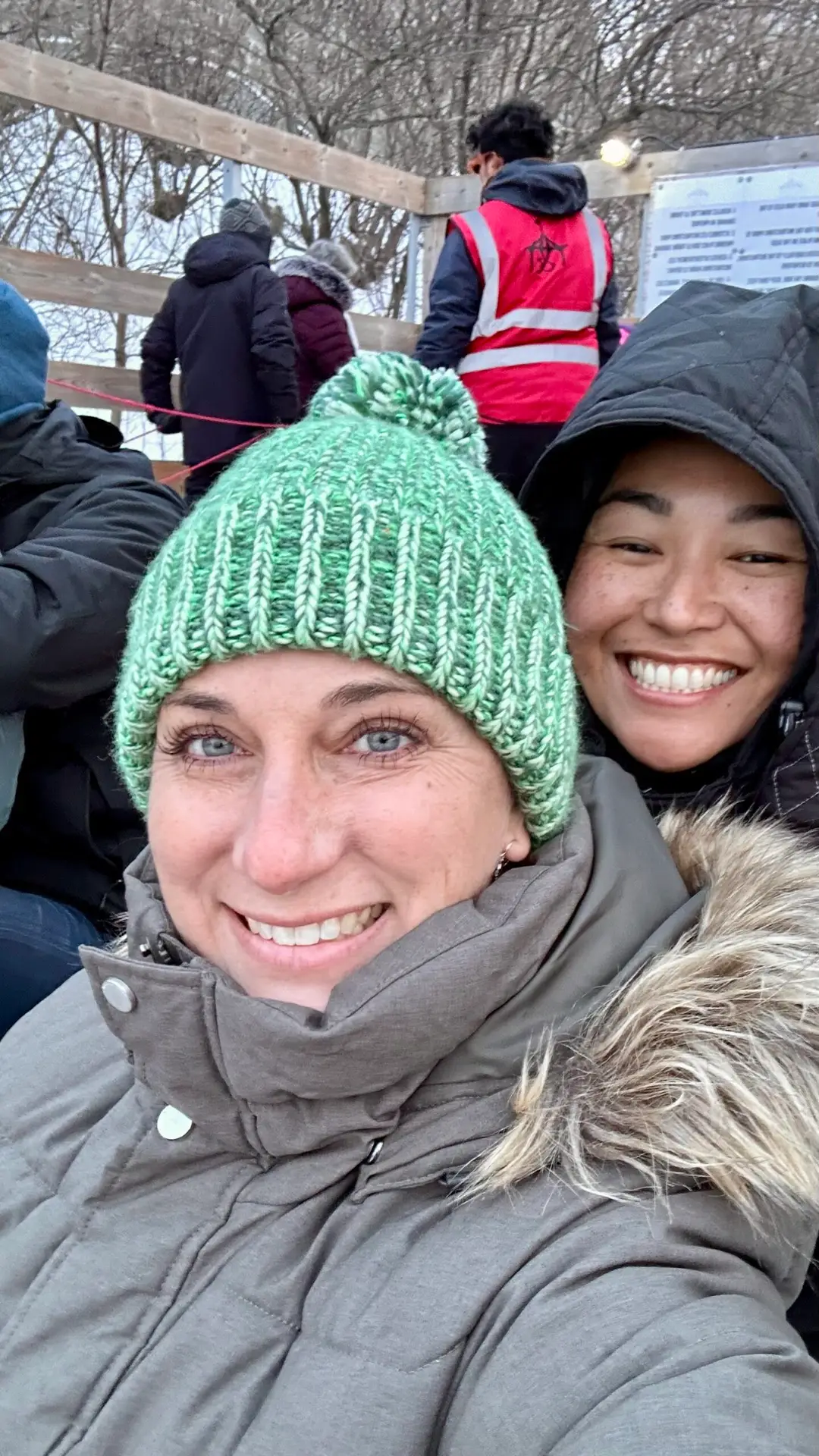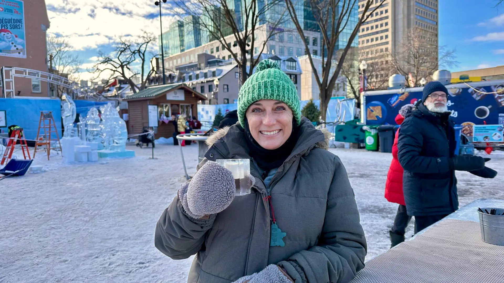 The next day we got to see the canoe race and do some ice fishing. As we arrived at the canoe race, the sounds of cheering crowds echoed against the icy St. Lawrence River. The canoe race, a time-honored tradition dating back to the carnival’s inception in 1955, unfolded in a flurry of paddles and determination! Once crafted from sturdy wood, today’s canoes are made of fiberglass and are much lighter. The race takes the teams up the St. Lawrence River, navigating first over solid ice, then over water with icebergs to dodge, and back over the solid ice again. It is a popular event with many teams and many, many people there to cheer them on. The ice fishing setup was especially exciting for Tiff. They put 3,000 trout in the water for people to catch, and while the trout were rather elusive, the thrill of the chase and the camaraderie of fellow anglers was enough for Tiff. This day, we also indulged in maple syrup taffy, a tantalizing treat for the taste buds. With maple syrup drizzled over snow or ice chips, we watched the transformation as the syrup hardened into a sticky confection. We rolled our popsicle sticks over the sticky taffy, creating a maple taffy lollipop that certainly left us wanting more – yum!