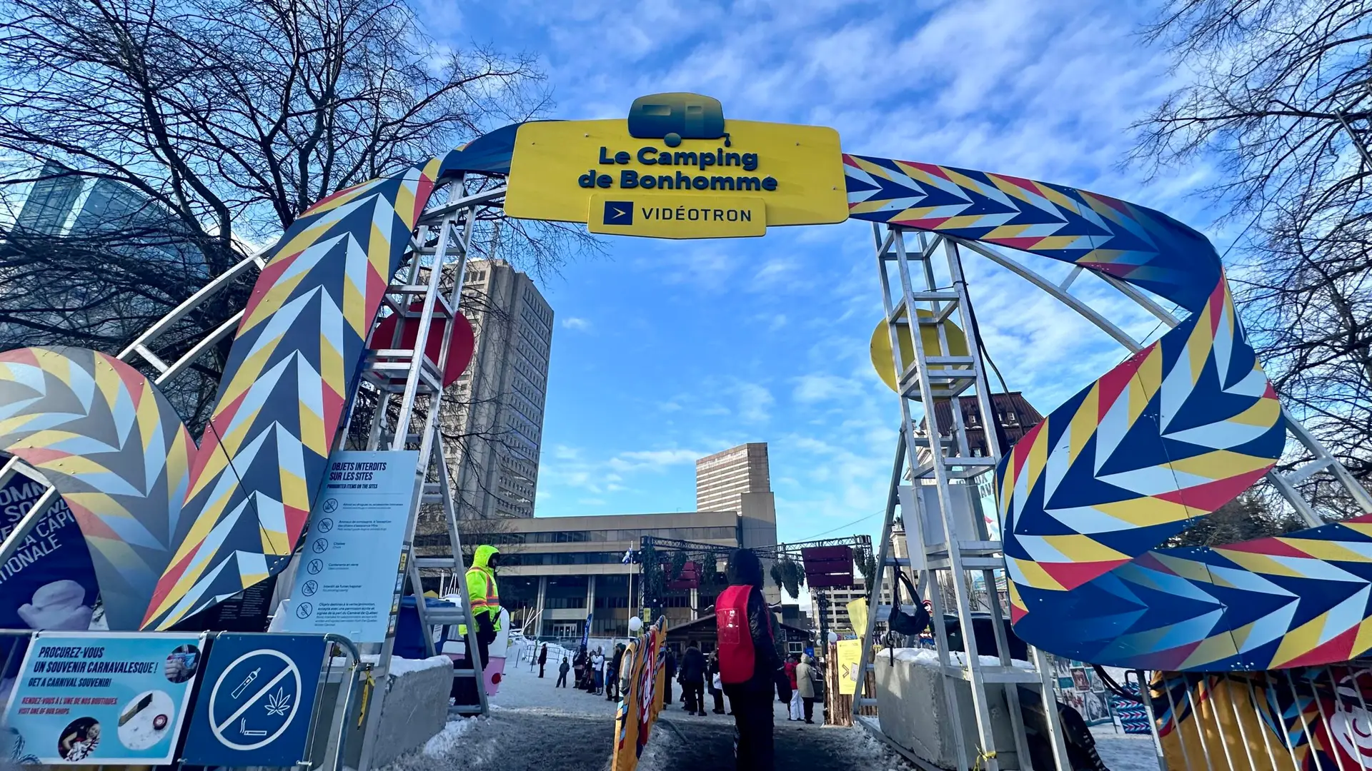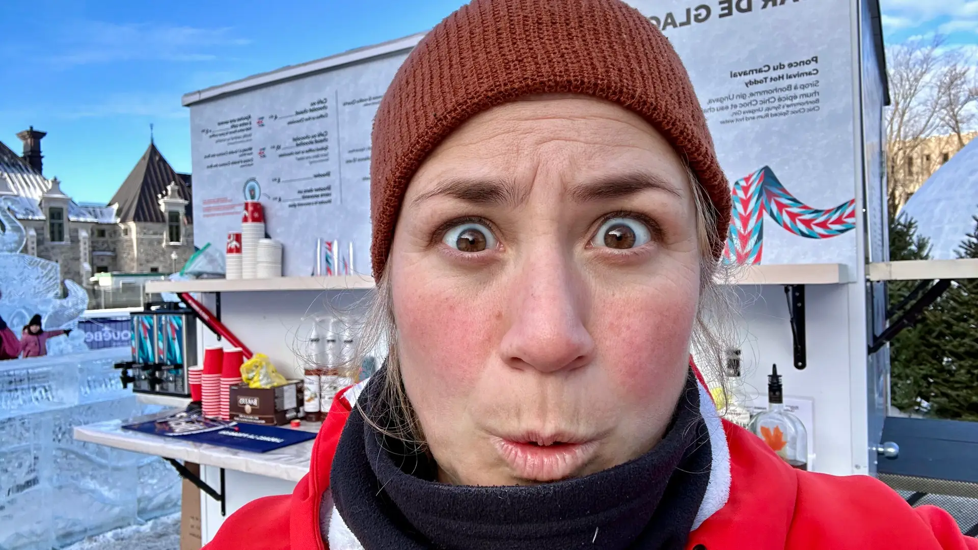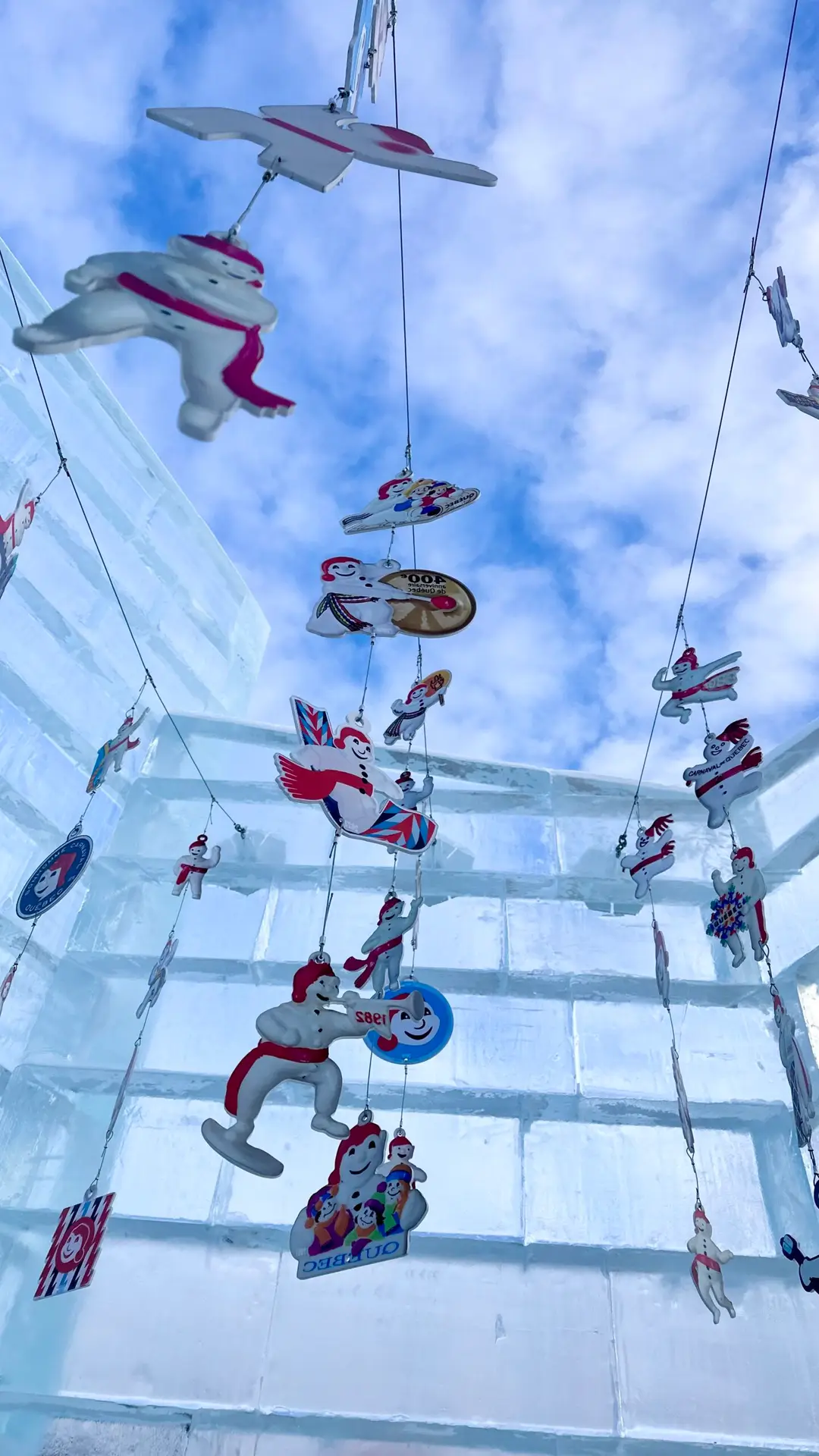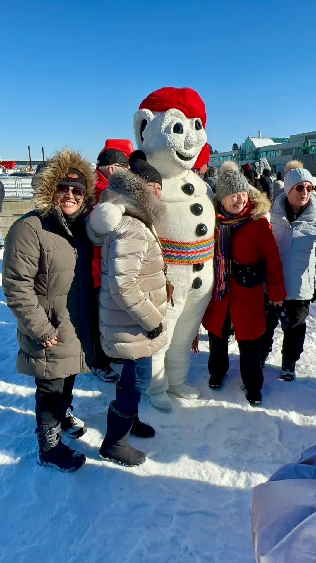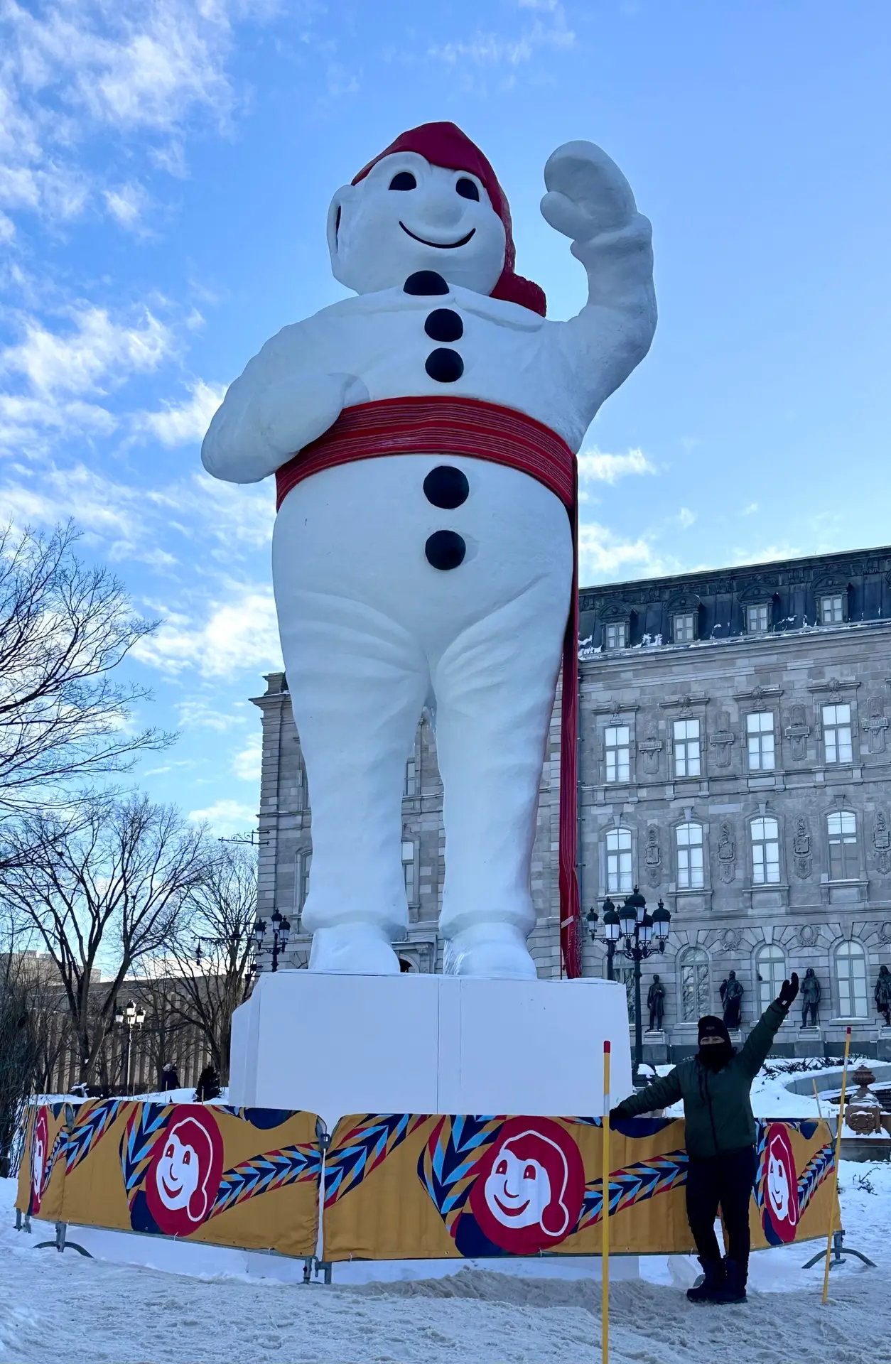 The festival’s effigy, Bonhomme Carnaval, is the iconic symbol of Quebec’s Winter Carnaval. The effigy changes yearly and is the official pass for the entire carnival. You just tie it to your coat, and for $30CAD, it gives you access to every carnival event. Bonhamme Carnaval was born from a snowflake and is now a jovial seven-foot snowman adorned with a red cap and a warm smile. He wears a distinctive sash featuring the colors of the Quebec flag – these sashes were traditionally used to tie coats tighter around the waist for warmth and to support the back during hard work. Bonhamme has been a beloved ambassador of the carnival since its beginning, spreading joy and laughter wherever he goes. Statues of Bonhamme are scattered throughout the city, and he makes appearances at every carnival event. We were able to see him in action a few times, and Tiff even chased him down to get a picture – and a dance! – with him. Bonhamme’s presence adds an element of tradition and folklore to the Winter Carnaval. His origins can be traced back to Quebecois folklore, where he symbolizes the resilience and joy of the people in the face of winter’s challenges. It was clear that today he continues to hold a special place in the heart of both locals and visitors alike.