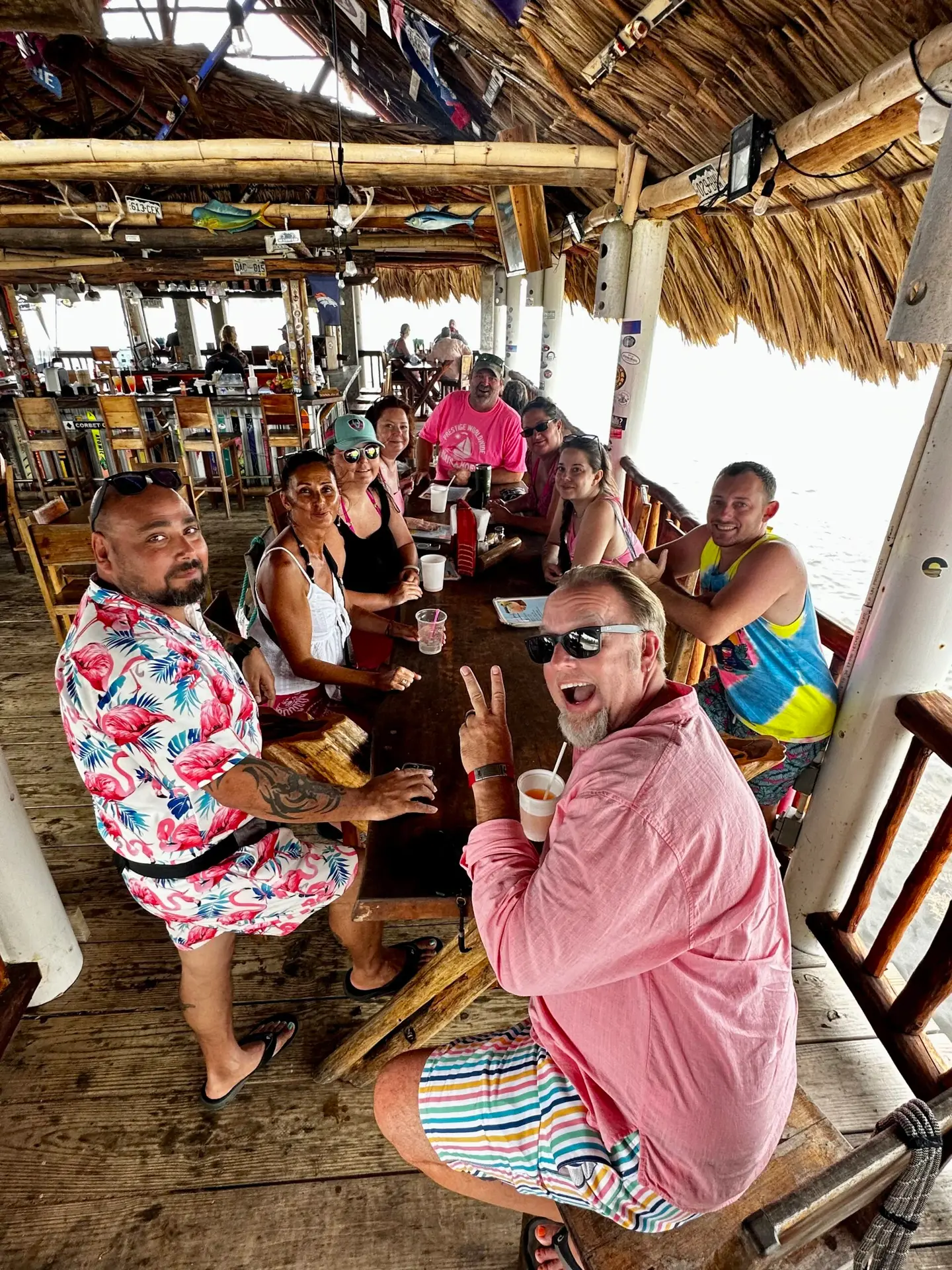 Our friends picked us up on our rented golf carts today, and we headed to Palapa Bar. Palapa Bar was FUN! They have inner tubes tied up in the water for drinkin’/chillaxin’, and there’s even a pulley system so they can send a bucket of beer to you in the water. Genius! After Palapa Bar, we went to the Dog House for happy hour. Great place, and the bartender, Kenny G (supposedly this nickname has no connection to the musician – he only recently learned of the famous Kenny G), was a hoot! The food was delicious as well. From there, we went to Rum Dog for dinner. After dinner, we hit up some of the other bars. My favorite was probably Sandy Toes.