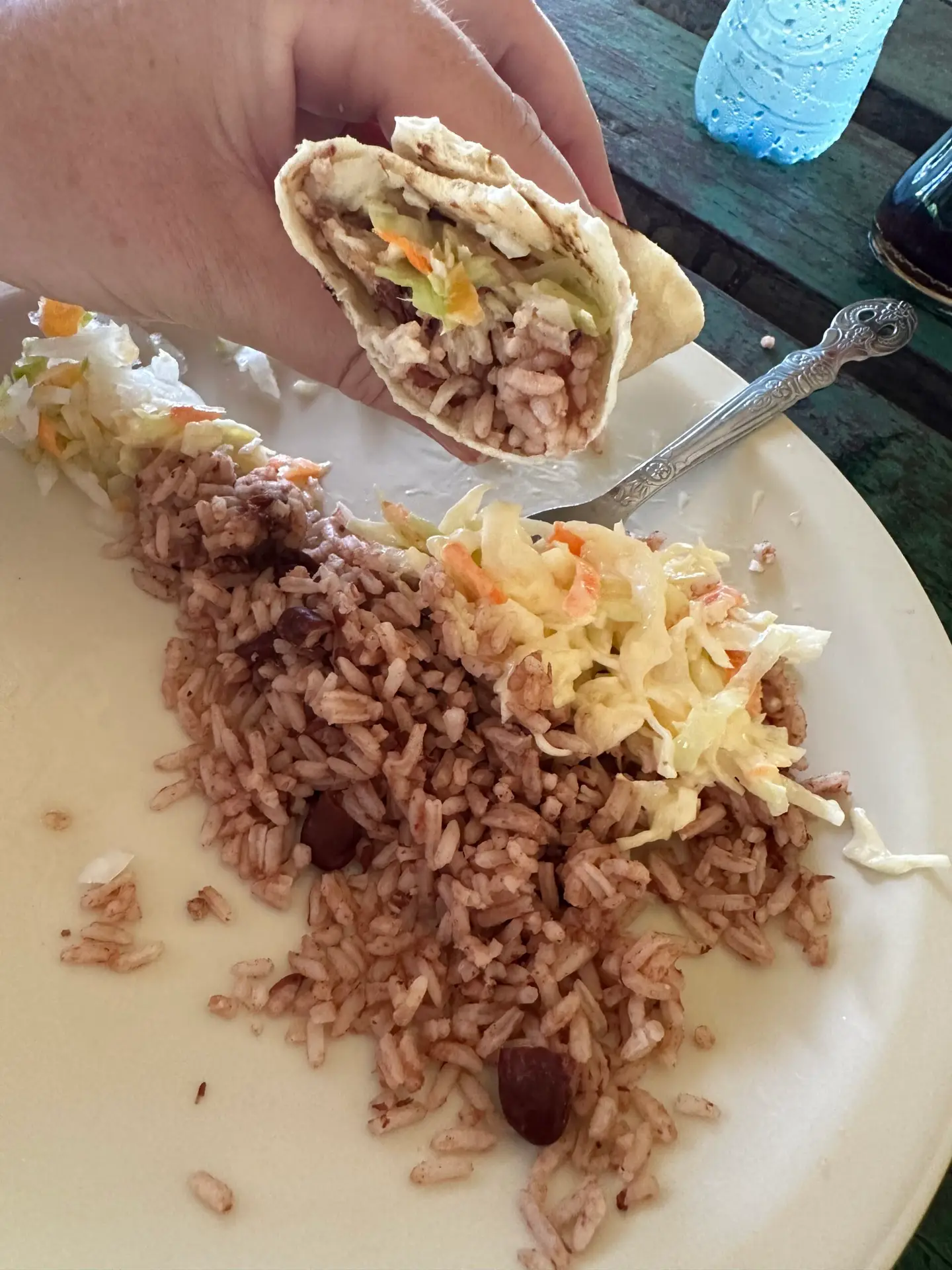 The final temple of this tour was the Mask Temple. The Mask Temple is a site renowned for its remarkable stucco mask adorned with intricate carvings. This mask is widely thought to represent a revered deity or mythical figure from Mayan mythology. Ascending the steep stairway of the Mask Temple not only provided us with another breathtaking view of the lush Lamanai jungle but also offered a chance to connect with the rich Mayan heritage and its artistic mastery. Following our exploration of the Mask Temple, we made our way back towards the entrance and were treated to a scrumptious lunch. Terri and I had wisely brought along our own tortillas which we just couldn’t get enough of (we even bought tortillas to leave the country with they were so good!). Our foresight paid off, as lunch consisted of a classic Belizean dish: beans and rice with a side of coleslaw, which paired perfectly with our tortillas.