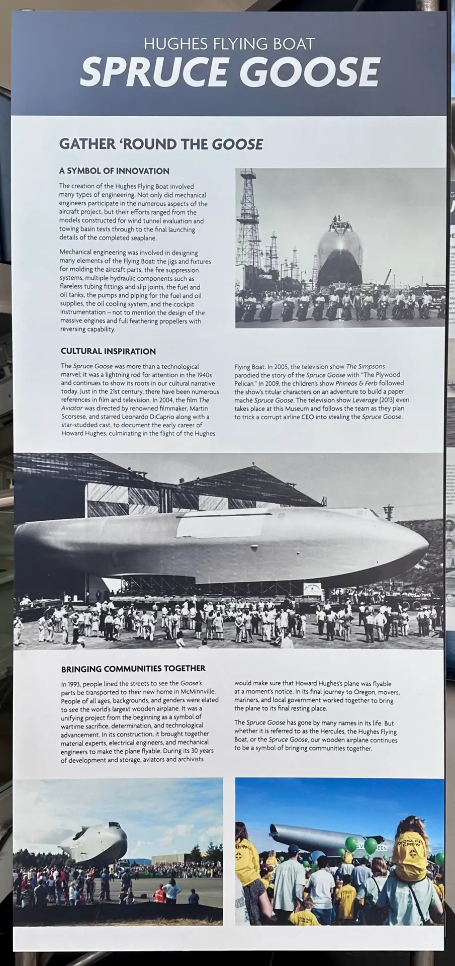 Once settled into my hotel, I decided to explore the Evergreen Aviation & Space Museum, highly recommended by some of my colleagues. While it was undeniably impressive for aviation enthusiasts, including the runway-like road driving in, I found it wasn’t quite my cup of tea as planes aren’t really my passion. Nevertheless, it offers a comprehensive collection for those who enjoy aviation, space, and war history. Its main attraction is the enormous Spruce Goose, which I’ll admit was pretty amazing to see. The Spruce Goose, officially known as the Hughes H-4 Hercules, was a colossal flying boat aircraft conceived by Howard Hughes during World War II. This mammoth aircraft has a wingspan of 320 feet, making it larger than a football field. It is a wooden vessel powered by eight engines. The Spruce Goose completed its maiden flight on November 2, 1947, in Long Beach, California, reaching a modest altitude of around 70 feet and flying for a mere mile. However, the aircraft never flew again, and it found its permanent home at the Evergreen Aviation & Space Museum.