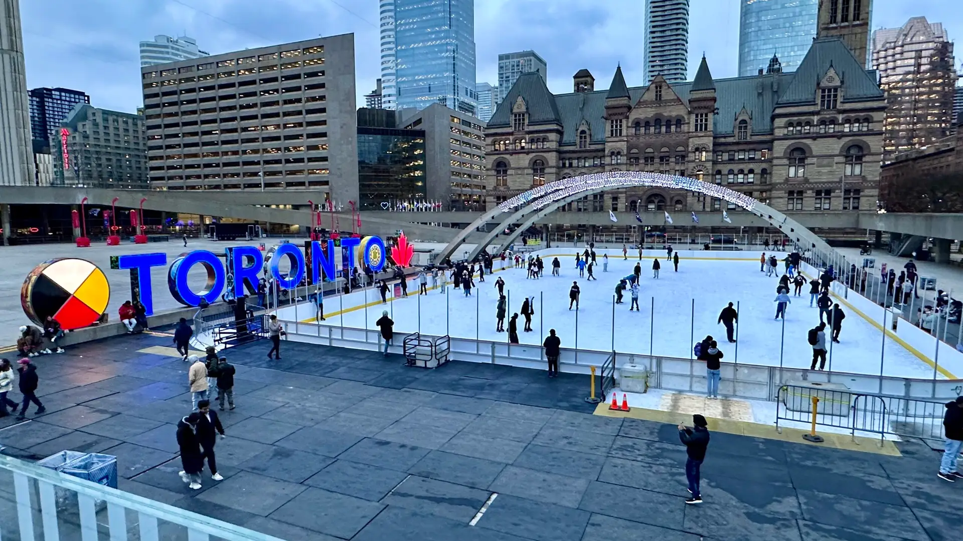- Nathan Phillips Square is a busy public square located in the heart of downtown Toronto, directly in front of Toronto City Hall. Named after Nathan Phillips, the former mayor of Toronto who oversaw the construction of the new City Hall in the 1960s, the square serves as a hub of activity and events throughout the year. Its prominent features include the iconic Toronto sign, a large, illuminated structure spelling out the city’s name, which has become a popular backdrop for photos. The square also boasts a reflecting pool that doubles as an ice rink in the winter months, offering recreational opportunities for skating enthusiasts, and there was no shortage of people enjoying the ice rink while we were there! Surrounding the square are various cultural institutions, including the Toronto City Hall and the Toronto Eaton Centre, as well as numerous restaurants, shops, and hotels, making it a focal point for both locals and tourists to gather, socialize, and enjoy the dynamic energy of downtown Toronto.